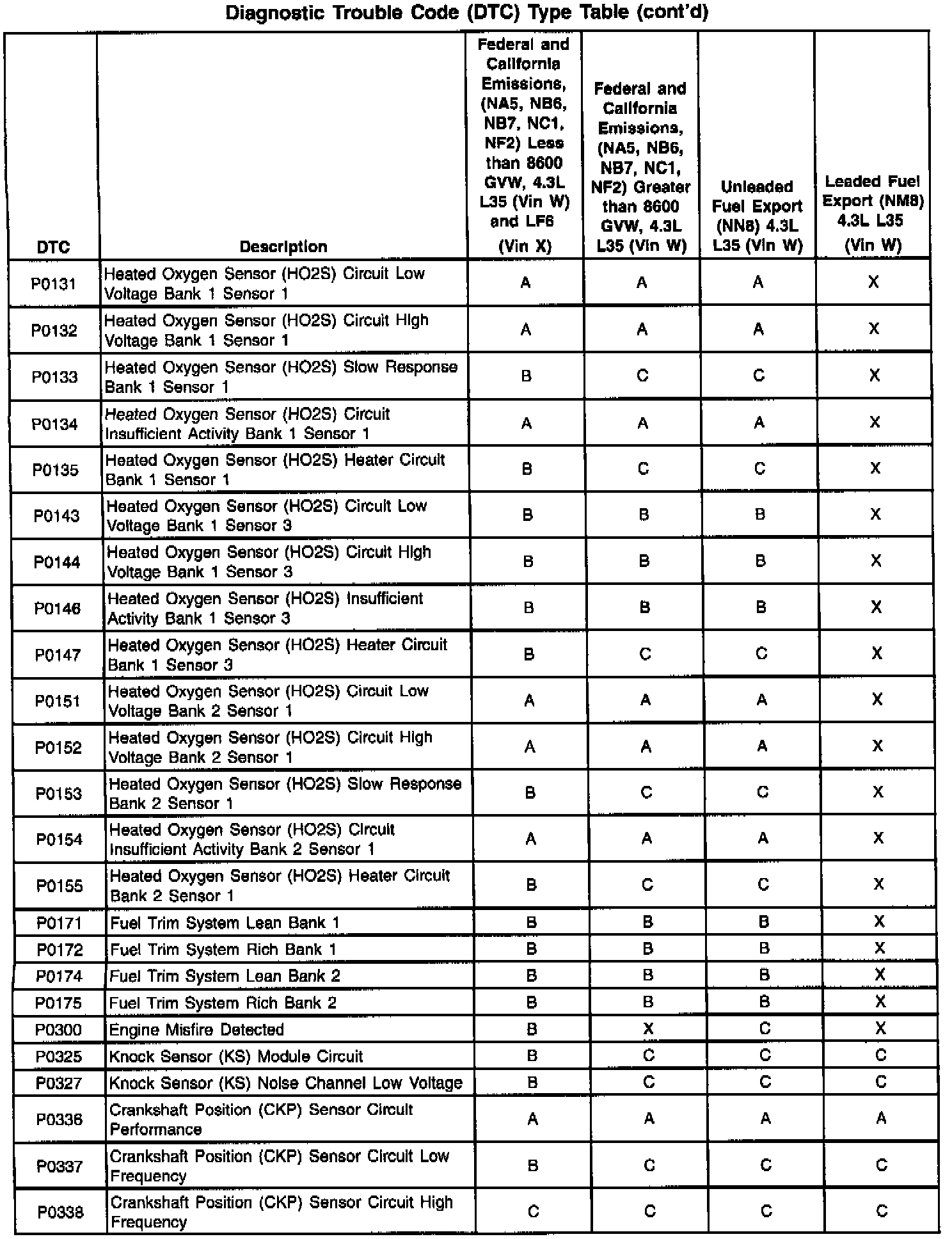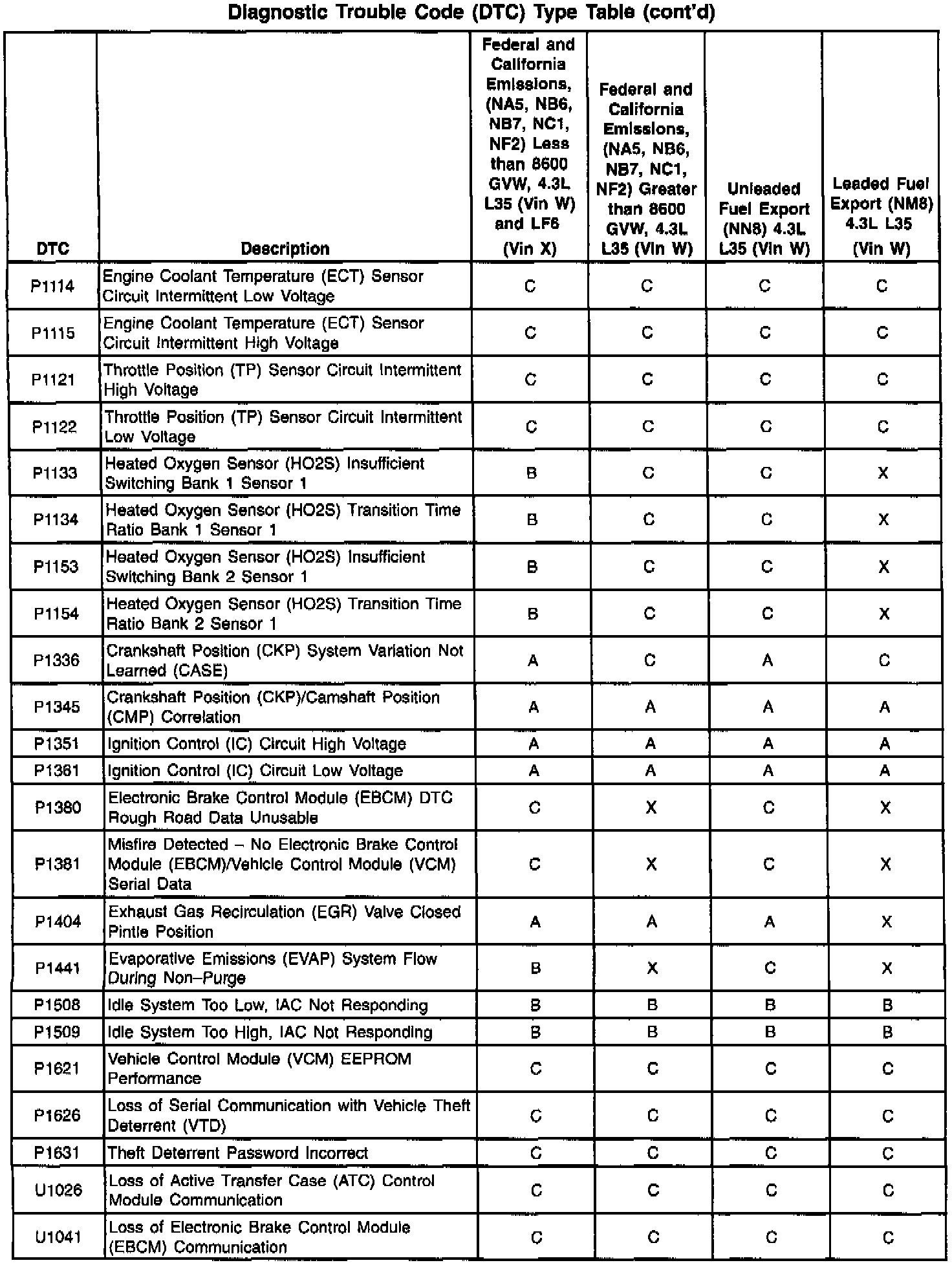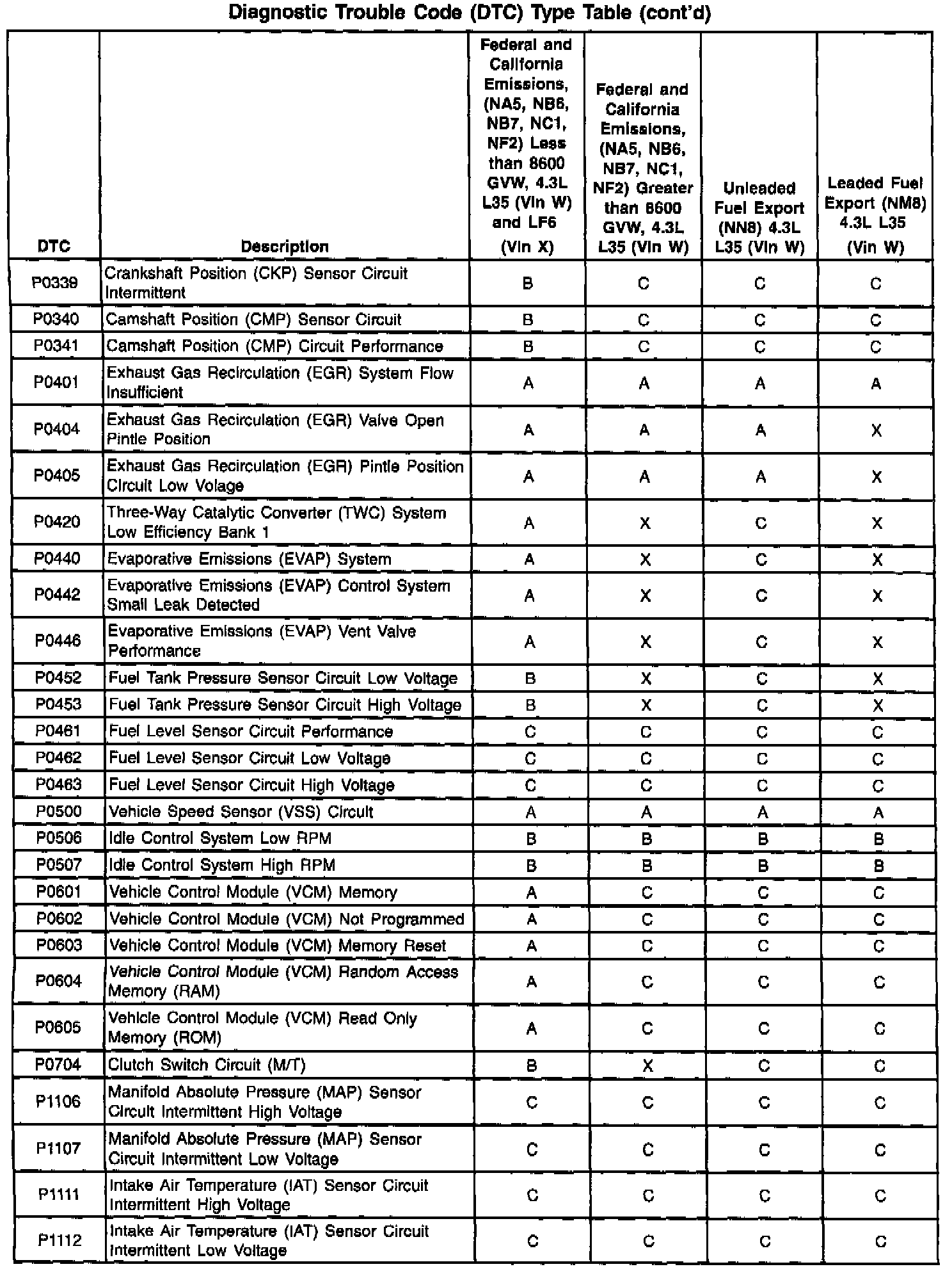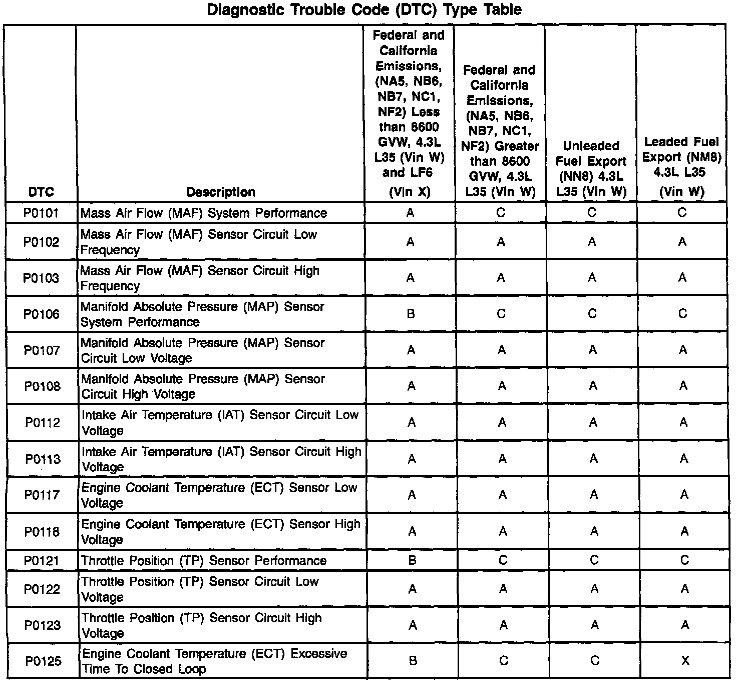 This information refers to domestic and Export calibration packages. Export vehicles may have differences in the DTC types that will affect the Malfunction Indicator Lamp (MIL) operation. Certain DTCs have been changed from type A to type C or, in some cases, type X. When a type A diagnostic fails, a DTC is set immediately and the Malfunction Indicator Lamp (MIL) is illuminated. When a type B DTC diagnostic fails, the Malfunction Indicator Lamp (MIL) will illuminate if the fault is present after two consecutive drive trips. A type C DTC will set after one failure and be stored in history but will not illuminate the Malfunction Indicator Lamp (MIL). Type X DTCs have been turned off (the diagnostic does not run, no codes are stored, and the Malfunction Indicator Lamp (MIL) will not illuminate.