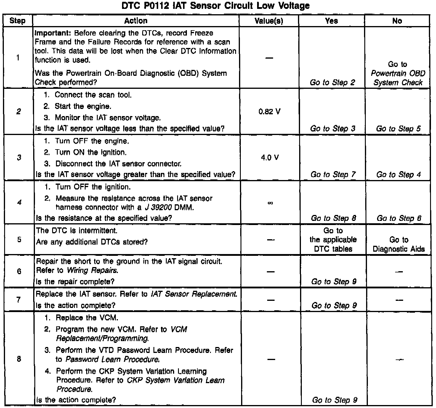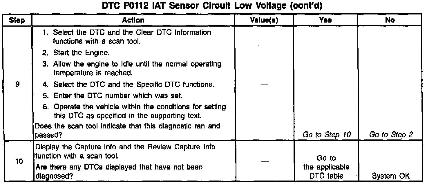 A scan tool indicates the temperature of the ambient air entering the throttle body. The air temperature should read very close to the temperature of the outside air. The air temperature should rise gradually as the engine warms up and the underhood temperature increases. If DTC P1112 is set, the problem is intermittent. Check for a short to ground in the IAT sensor signal circuit. This may be accomplished by moving the VCM harness at various locations and monitoring the IAT temperature or the IAT voltage on the scan tool. If the voltage varies, look for a short to ground in the area of the harness that caused the variance. Also, a sensor may become skewed or mis-scaled. The Temperature vs. Resistance Value Table will help to detect a skewed sensor. Refer to Specifications / Temperature vs Resistance.