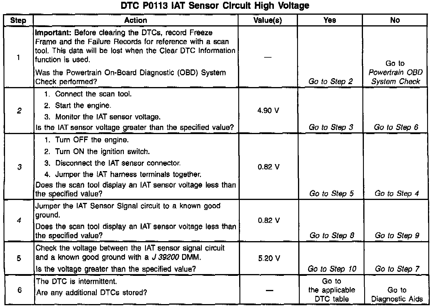 2. If the IAT sensor circuit voltage measures greater than 4.90 volts, the conditions for the DTC are still present, and the problem is not intermittent.