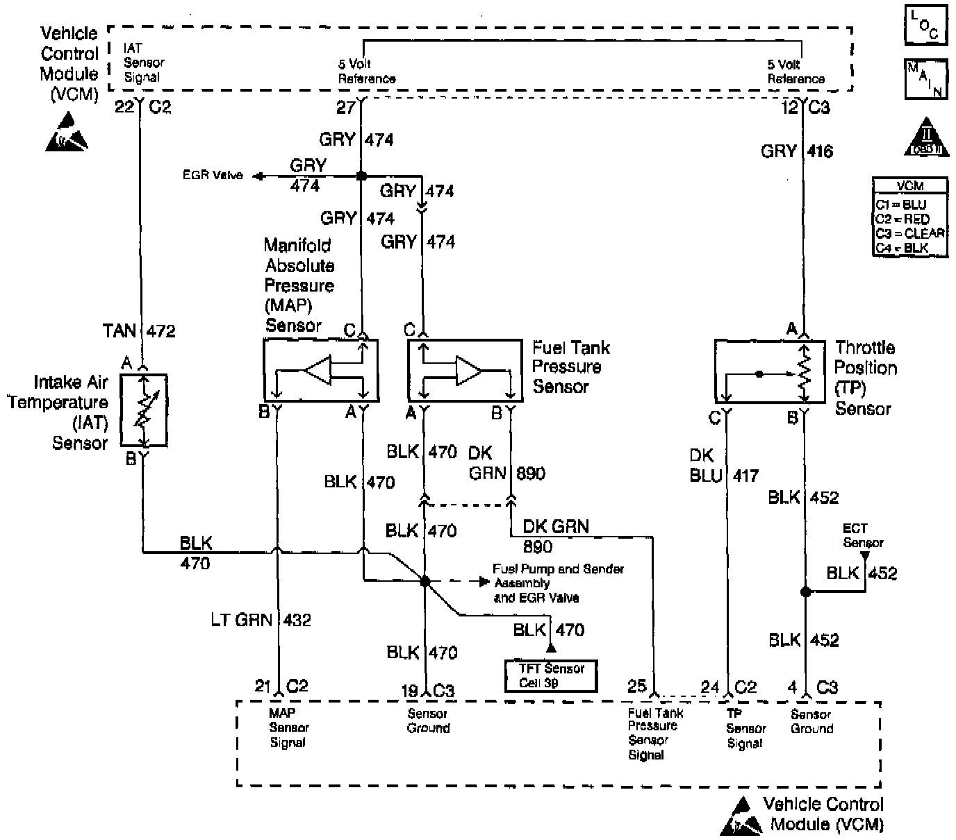 The Intake Air Temperature (IAT) sensor is a thermistor located in the fresh air duct to the throttle body in order to monitor the temperature of the air entering the throttle body. The VCM applies 5 volts to the sensor on the 5 volt reference circuit. When the air is cool, the resistance in the sensor measures high and the VCM senses a high voltage signal. If the air is warm, the sensor resistance measures low and the VCM senses a low voltage signal.