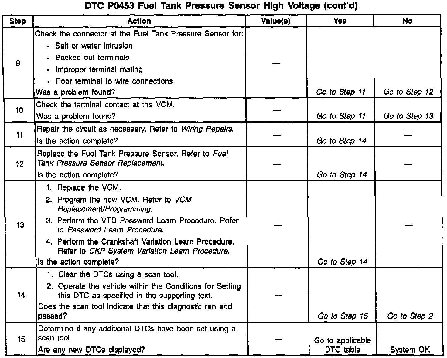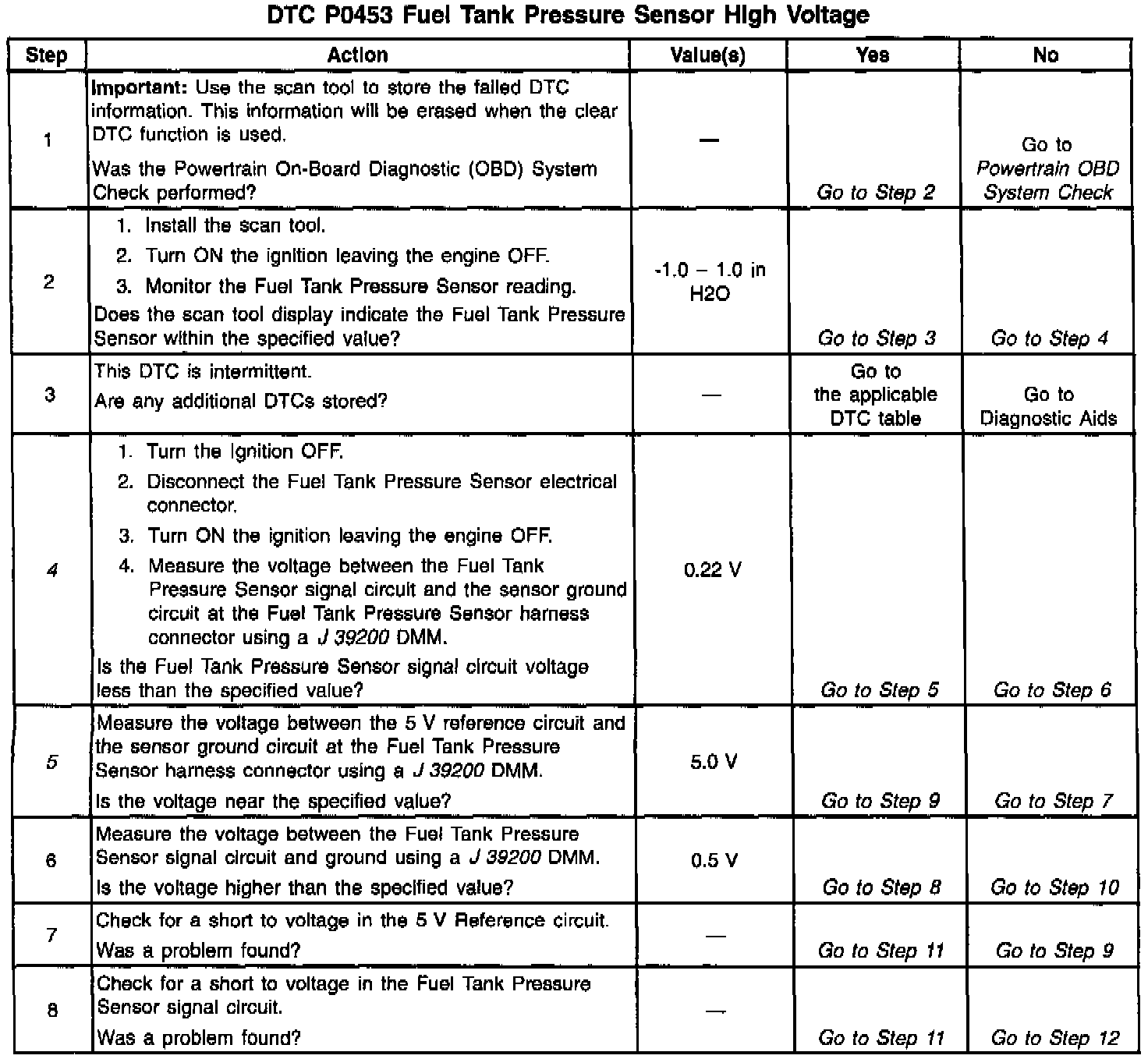 The Fuel Tank Pressure Sensor diagnosis table is intended to isolate and diagnose the electrical problems with the sensor wiring or the sensor.