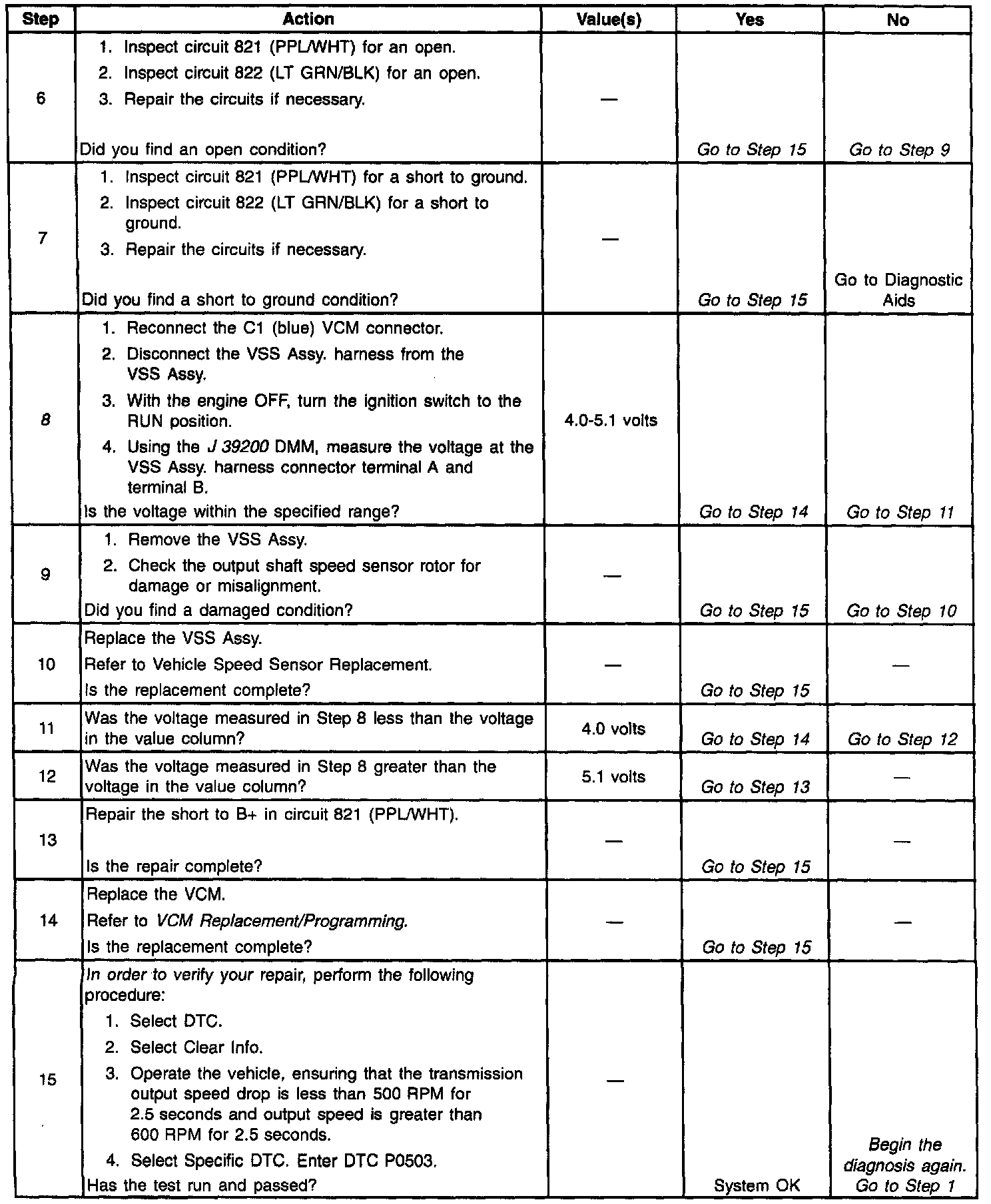 The Vehicle Speed Sensor Assembly (VSS Assy.) provides vehicle speed information to the Vehicle Control Module (VCM). The VSS Assy. is a Permanent Magnet (PM) generator. The PM generator produces a pulsing AC voltage as rotor teeth on the transmission output shaft pass through the sensor's magnetic field. The AC voltage level and the number of pulses increase as the speed of the vehicle increases. The output voltage varies from a minimum of 0.5 volts AC at 100 RPM to more than 100 volts at 8000 RPM. The VCM converts the pulsing voltage to vehicle speed. The VCM uses the vehicle speed signal to determine shift timing and Torque Converter Clutch (TCC) scheduling. When the VCM detects an unrealistically large drop in vehicle speed, then DTC P0503 sets. DTC P0503 is a type B DTC.