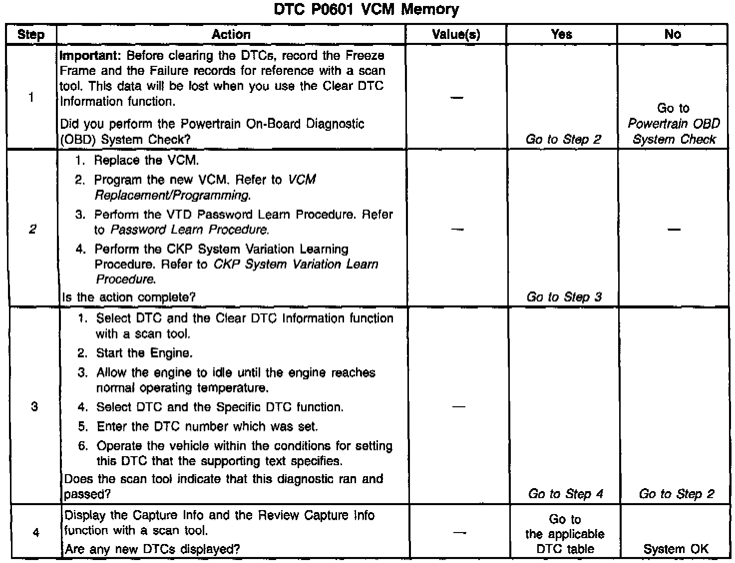 The VCM Program Memory contains data which is essential to running the engine and transmission. At Power-up, the VCM checks the integrity of this data. If the checksum of the Program Memory does not match a predetermined value, DTC P0601 sets.
