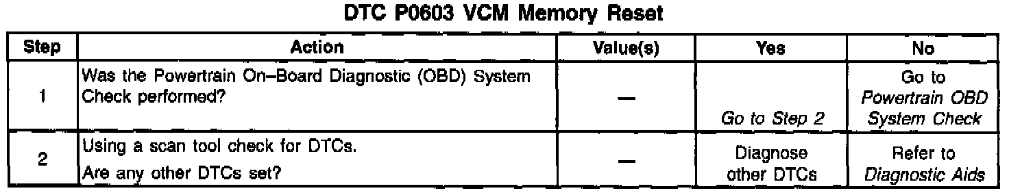 If the battery has been disconnected for any reason DTC P0603 will set. The VCM checks the memory at Power-up. If the memory changes, it will reset. An intermittent loss of power or ground to the VCM will also cause a reset.