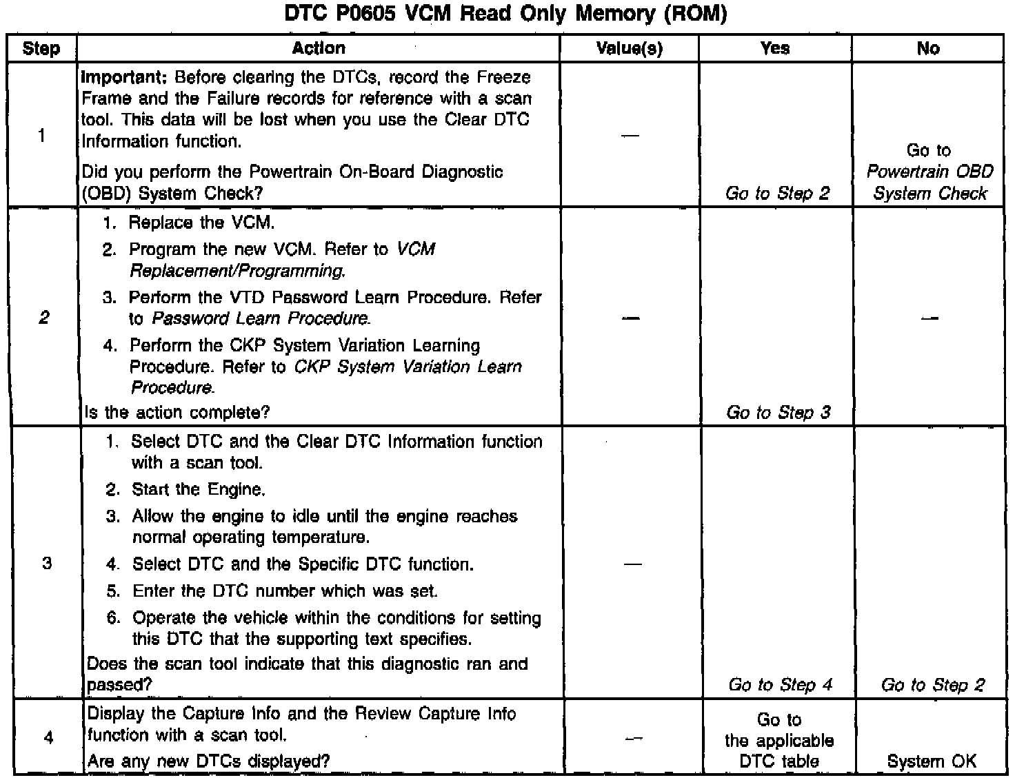 The VCM memory contains data which is essential to running the engine and transmission. The VCM checks the integrity of this data. If the checksum of the Boot Flash section of memory does not match a predetermined value, DTC P0605 sets.