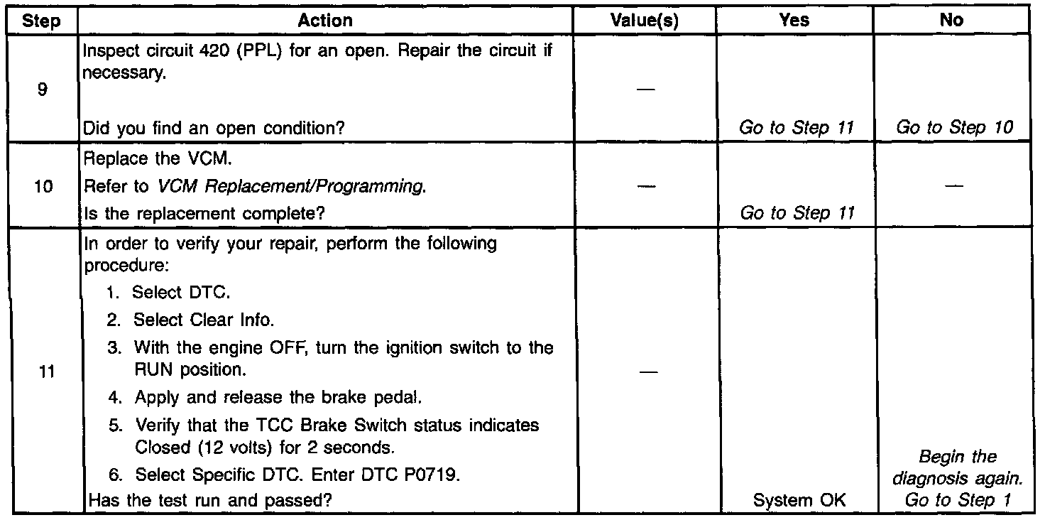 The brake switch indicates brake pedal status to the Vehicle Control Module (VCM). The brake switch is a normally-closed switch that supplies battery voltage on circuit 420 to the VCM. Applying the brake pedal opens the switch, interrupting voltage to the VCM. When the brake pedal is released, the VCM receives a constant voltage signal. If the VCM receives a zero voltage signal at the brake switch input, and the Torque Converter Clutch (TCC) is engaged, the VCM de-energizes the Torque Converter Clutch Solenoid Valve (TCC Sol. Valve). The VCM disregards the brake switch input for TCC scheduling if there is a brake switch circuit fault (Refer to DIAGNOSTIC AIDS). When the VCM detects an open brake switch circuit (0 volts, low input) during accelerations, then DTC P0719 sets. DTC P0719 is a type D DTC.
