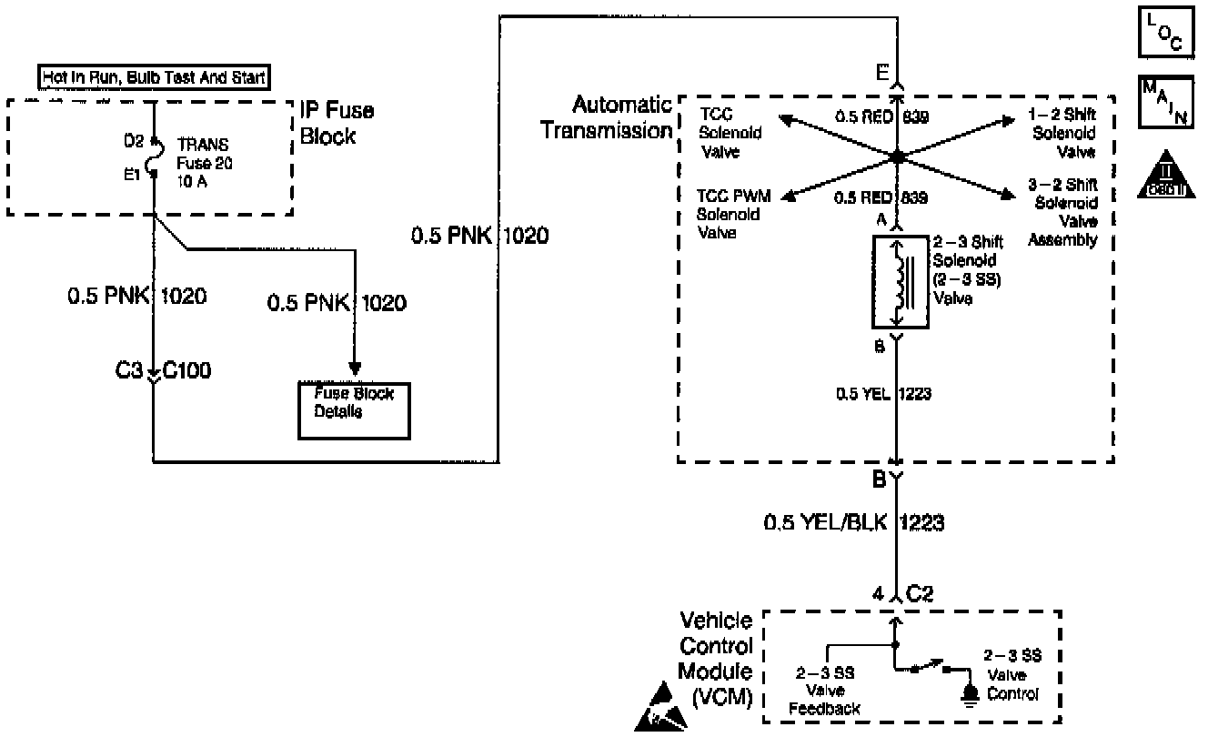 The 2-3 Shift Solenoid Valve (2-3 SS Valve) controls the fluid flow acting on the 2-3 shift valves. The solenoid is a normally-open exhaust valve. With the 1-2 Shift Solenoid Valve (1-2 SS Valve), the 2-3 SS Valve allows four different shifting combinations. The solenoid attaches to the control valve body within the transmission. The 2-3 SS Valve receives ignition voltage through circuit 1020. The Vehicle Control Module (VCM) controls the solenoid by providing the ground path on circuit 1223.