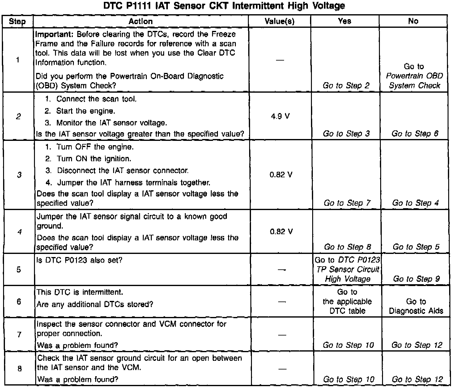 A scan tool indicates the temperature of the ambient air entering the throttle body. The air temperature should read very close to the temperature of the outside air. The air temperature should rise gradually as the engine warms up and the underhood temperature increases. If the DTC Pull is set, the problem is intermittent. Check for poor connections at the VCM and IAT sensor by wiggling the connector gently and monitoring the IAT temperature or IAT voltage on the scan tool. If the voltage waivers, repair the connector that caused the waiver. Also, a sensor may become skewed or mis-scaled. The Temperature vs. Resistance Value Table will help to detect a skewed sensor. Refer to Specifications / Temperature vs Resistance.