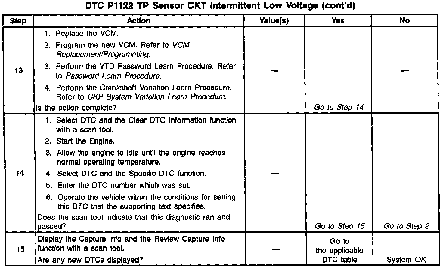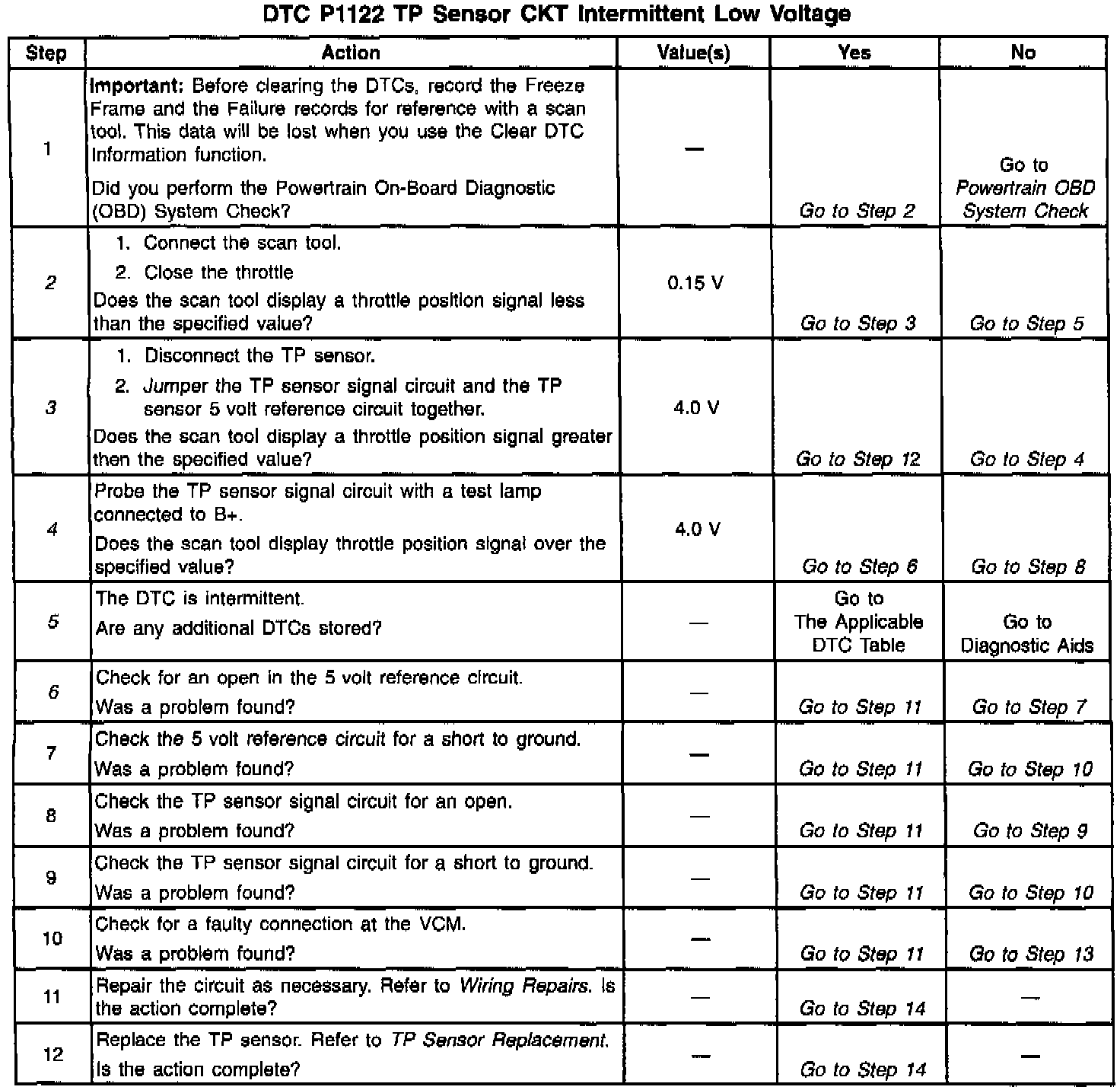 An open or short to ground in the 5 volt reference circuit or the TP sensor signal circuit results in a DTC P0122.