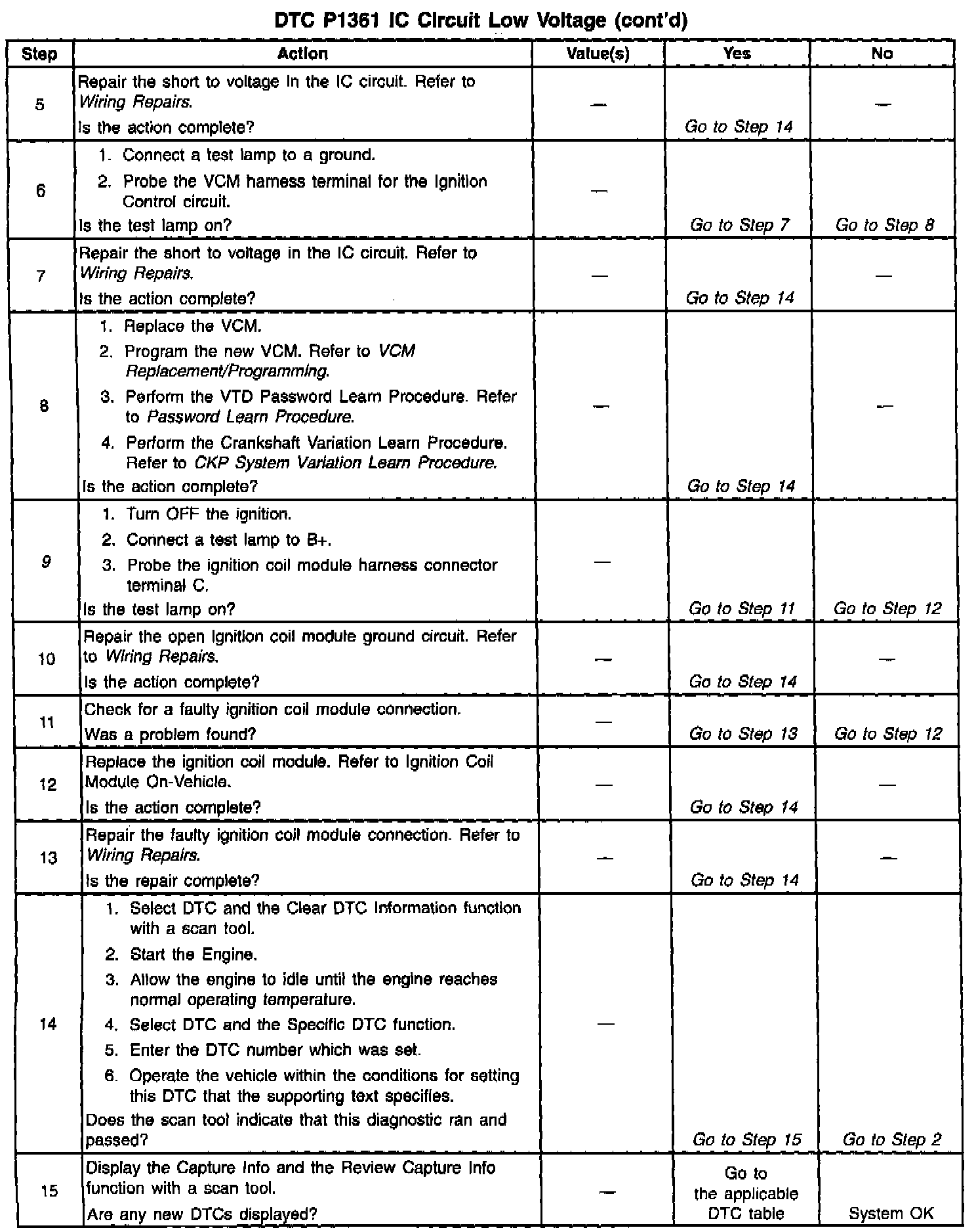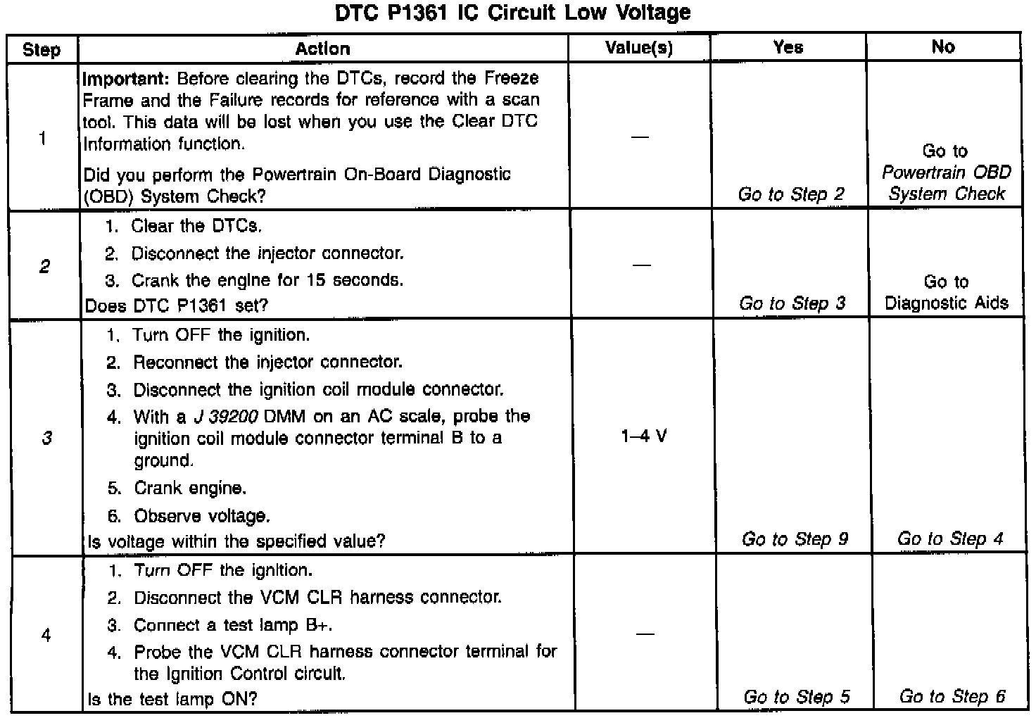 9. The remaining tests begins to check that the ignition coil module circuitry is OK. If the ignition coil module loses its voltage source, the secondary voltage will not be produced, and a DTC P1361 will set.
