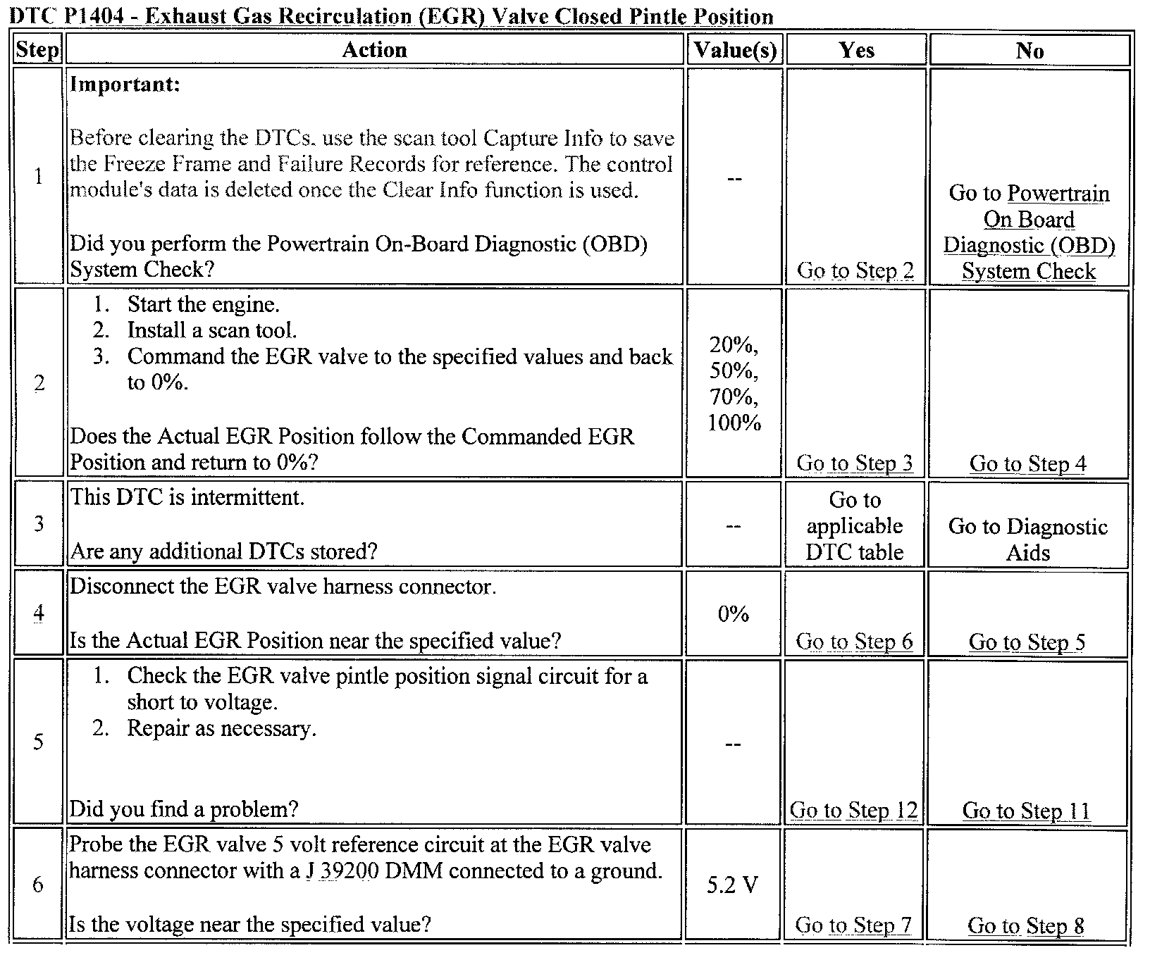 This diagnostic will detect the EGR pintle position not returning to the learned closed position due to foreign material lodged in the pintle seating area, or due to a defective EGR valve. The VCM will command the EGR valve fully open to attempt to clear the valve of any foreign material, although the vehicle must be at cruising speed for this to occur. If the third attempt to clear the valve is unsuccessful, the code P1404 will set.