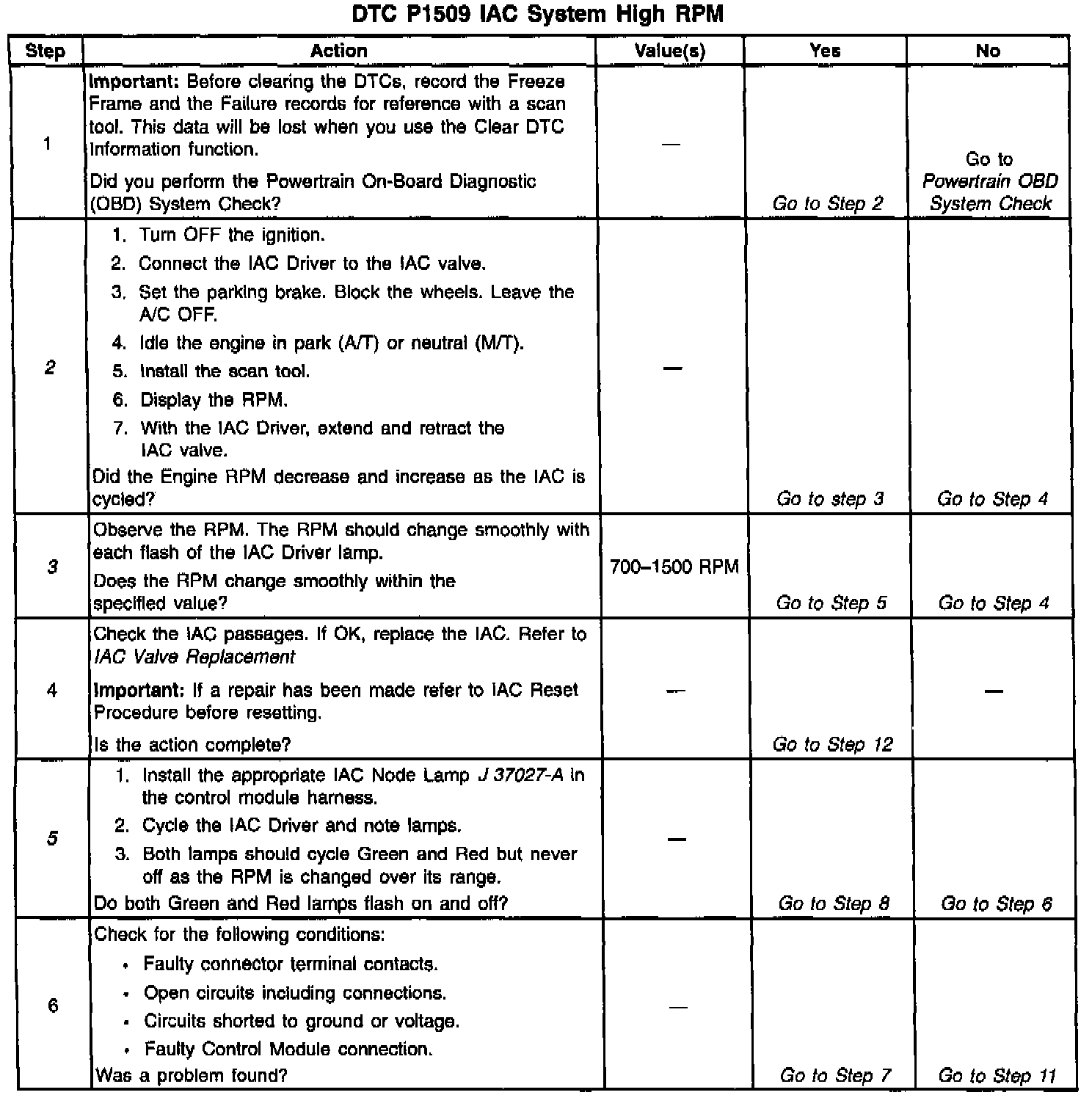 3. This step checks the quality of the IAC movement in Step 2. Between 700 RPM and about 1200 RPM, the engine speed should change smoothly with each flash of the tester lamp in both extend and retract. If the IAC valve is retracted beyond the control range (about 1500 RPM), it may take many flashes in the extend position before engine speed will begin to drop. This is normal on certain engines, fully extending IAC may cause engine stall. This may be normal.