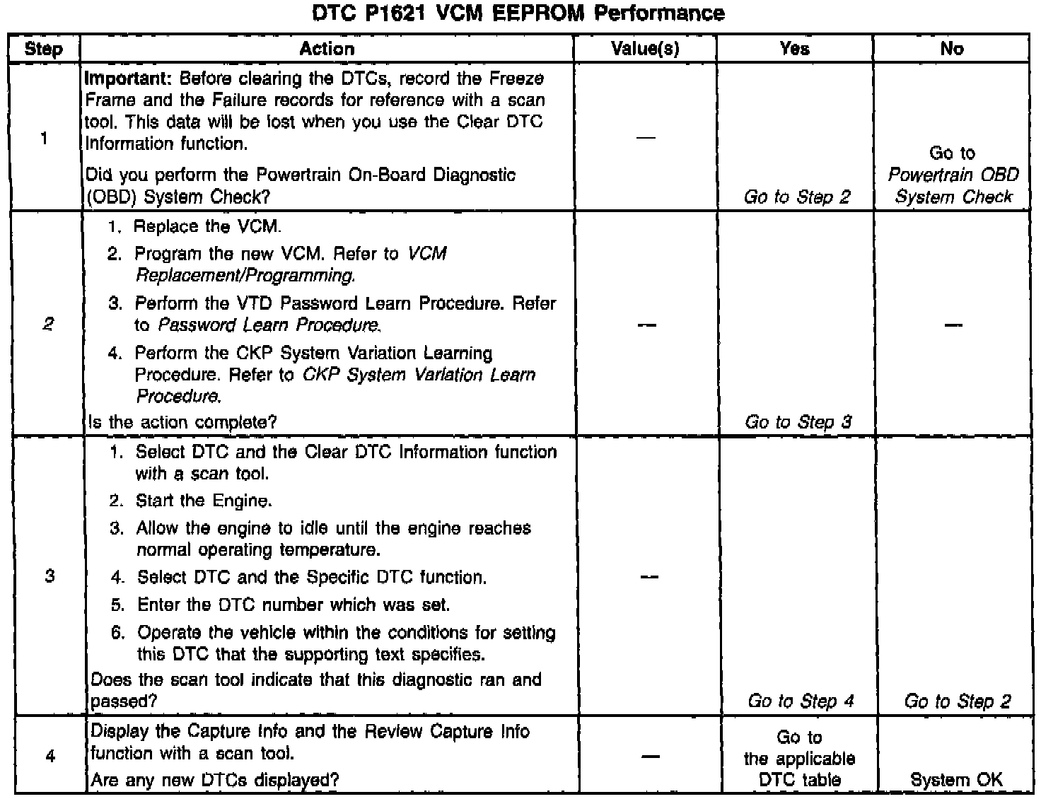 The VCM EEPROM contains data which is essential to running the engine and transmission. The VCM program stores this data in the EEPROM. This data is remains in the EEPROM even if the battery is disconnected. At Power-up, the VCM checks the integrity of this data. If the checksum of the EEPROM does not match a predetermined value, DTC P1621 sets.