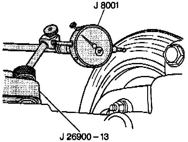 3. Fasten the J 8001 Dial Indicator to the steering knuckle so that the dial indicator button contacts the rotor surface about 25 mm (1.0 inch) from the outer edge.