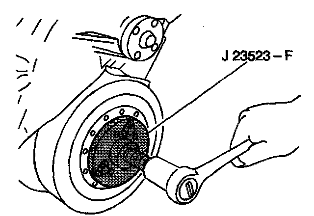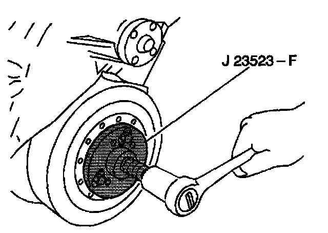 7. Use J 23523-F to remove the crankshaft balancer. Refer to Crankshaft Balancer Clean and Inspect.