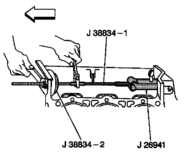 1.2. Install the J 38834-1 with the short threaded end through the balance shaft bore in the front of the engine block.