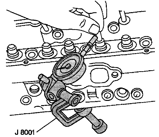 ^ Clamp the J 8001 on the exhaust port side of the cylinder head.