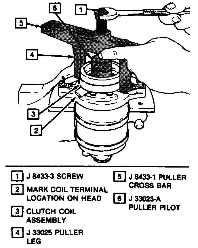 3. Tighten J 8433-3 forcing screw against the puller pilot to remove the clutch coil.