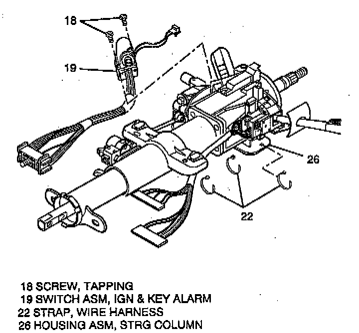 - Route wire harness through slot in steering column housing assembly (26). Secure wire harness with a wire harness strap (22) through hole located in the bottom of housing assembly (26).