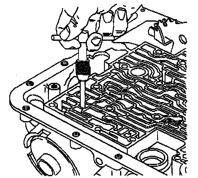 3. Perform the following functions: line up the oil feed slots in the third accumulator retainer and the ball assembly with the servo bore; Using a 9.5 mm (3/8 inch) diameter metal rod; install the third accumulator retainer and the ball assembly.