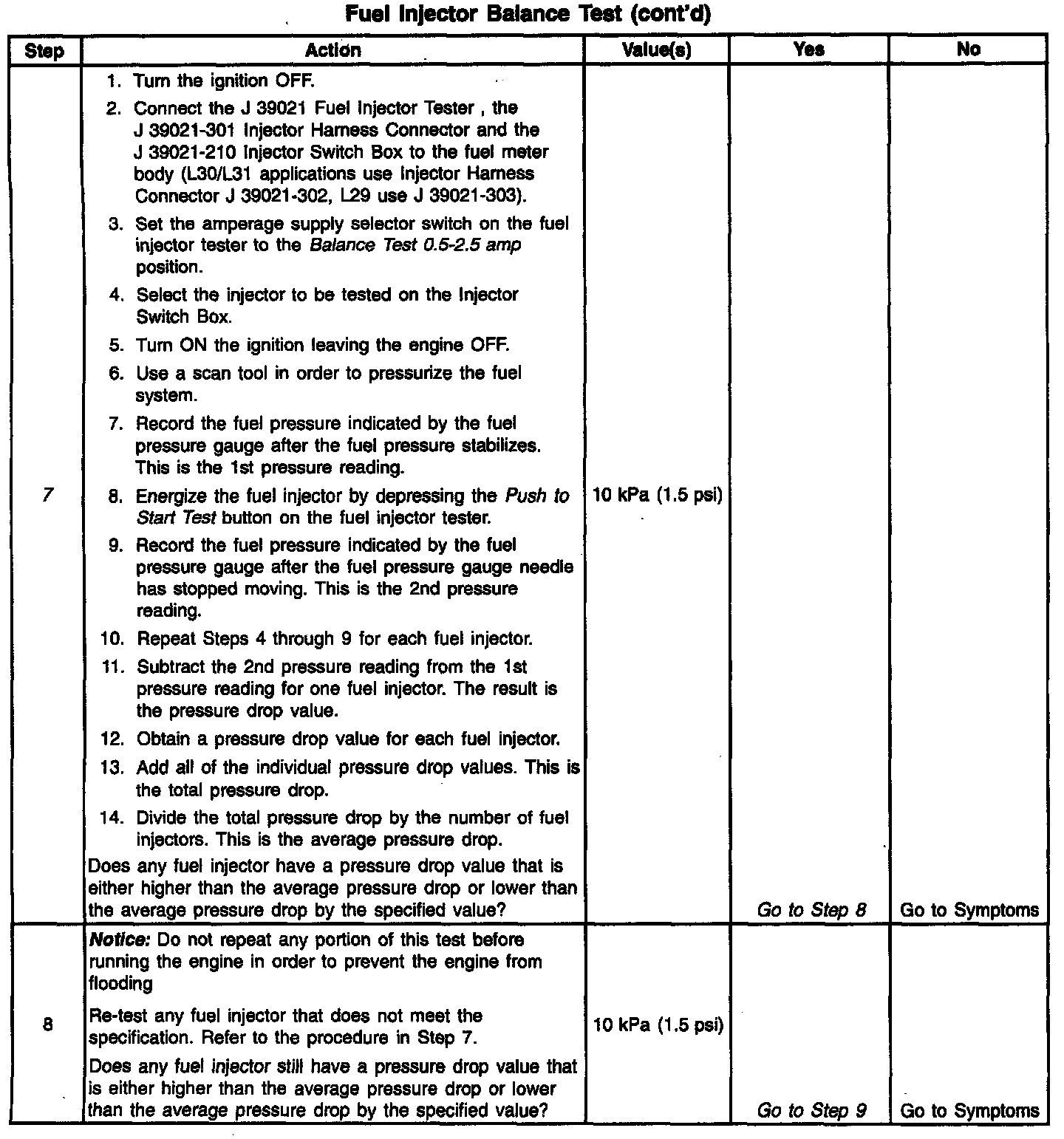 The Fuel Injector Tester J 39021, the Injector Switch Box J 39021-210 and the Injector Harness Connector J 39021-302 energize the injector for a precise amount of time allowing a measured amount of fuel into the manifold. This causes a drop in system fuel pressure that can be recorded and used to compare each injector. All injectors should be within the same pressure drop range, the average pressure drop value for all injectors is ±10 kPa (1.5 psi).