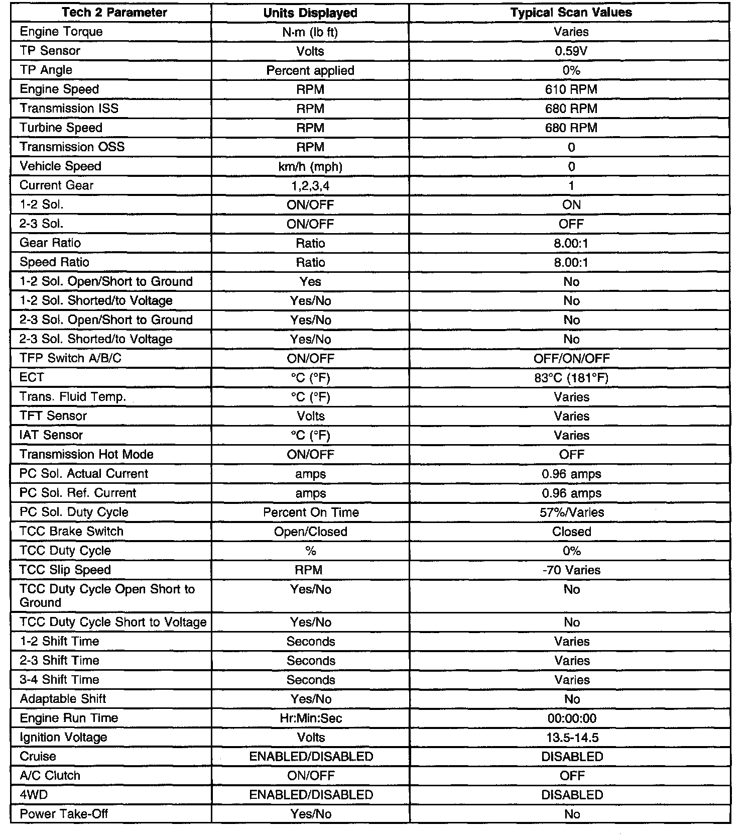 If you have completed the On-Board Diagnostic (OBD) system check, if the diagnostics are functioning properly and if no DTCs display, you may use the Typical Scan Values in the table below for comparison. These typical values are an average of display values recorded from normally operating vehicles. They represent the display from a normally functioning system.