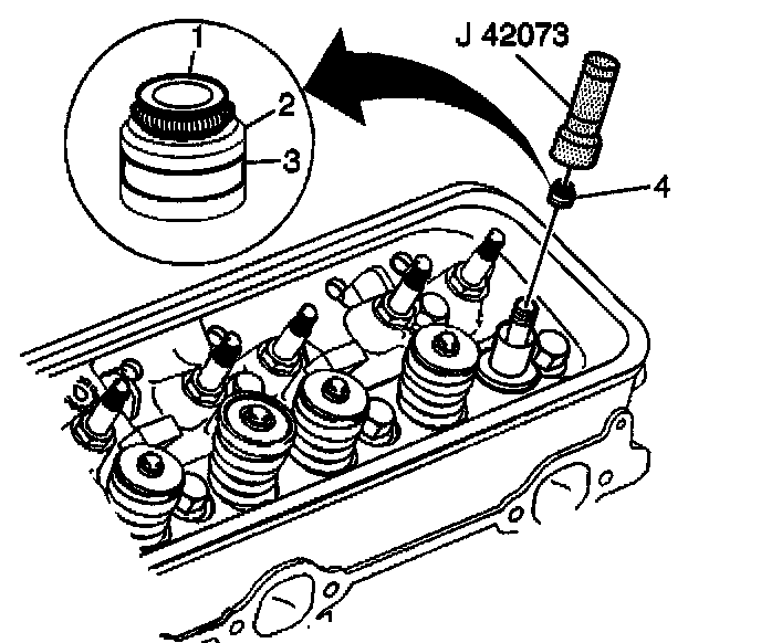 3. Assemble the valve stem oil seal onto the valve guide using the J 42073 and a hammer.