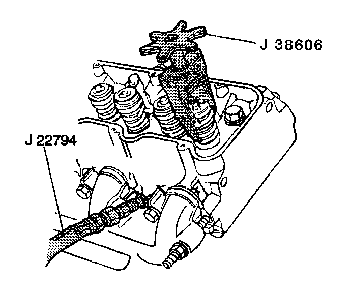 NOTICE: When using J 38606 ensure that the jaws are completely engaged on the valve spring. If the jaws are not completely engaged the jaws may slip off and scratch the valve spring. Replace the valve spring if the valve spring becomes scratch.