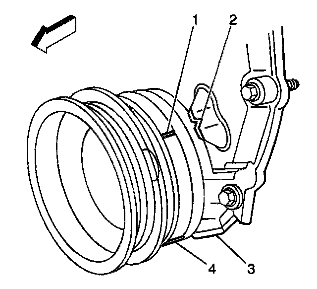 8. Rotate the crankshaft balancer to position the crankshaft balancer alignment mark (1) 57 - 63 degrees clockwise or counterclockwise from the engine front cover alignment tab (2).