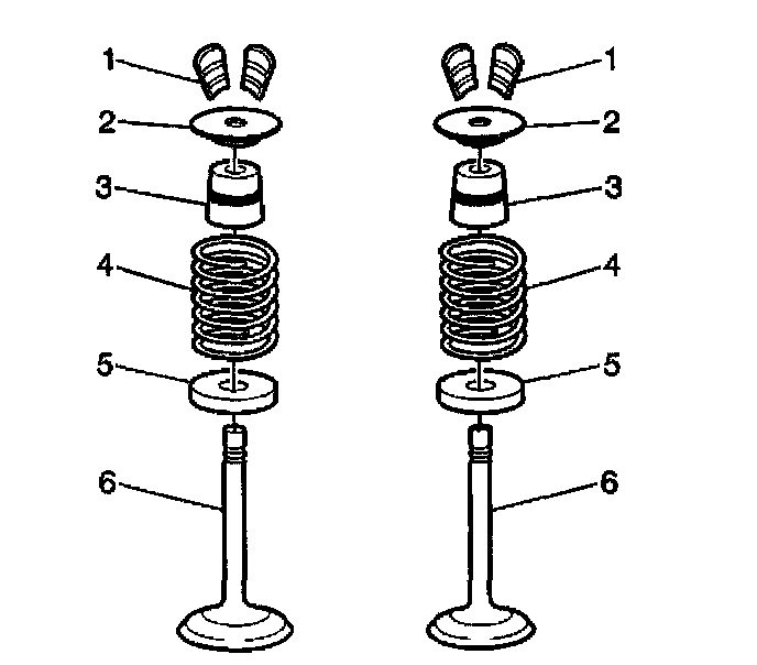 8. Remove the valve spring retainer (2) and the valve spring (4) from the cylinder head.