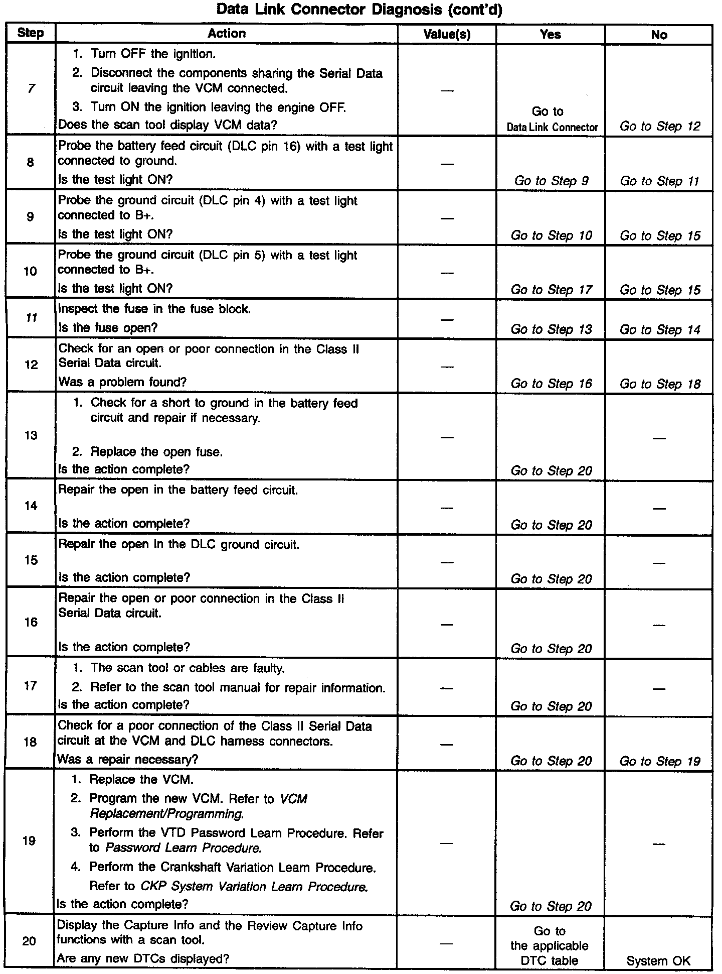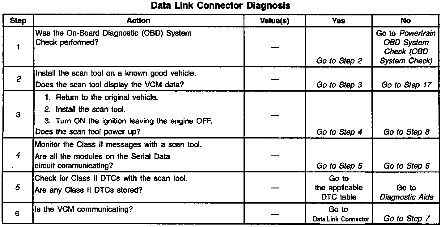 The Class II Serial Data circuit to the Data Link Connector (DLC) allows bi-directional communication between the Vehicle Control Module (VCM) and the scan tool. This is accomplished through pin 2 ot the DLC. If communication between the scan tool and the VCM cannot be established, the procedure in the DLC Diagnosis table should be used to diagnose the condition.