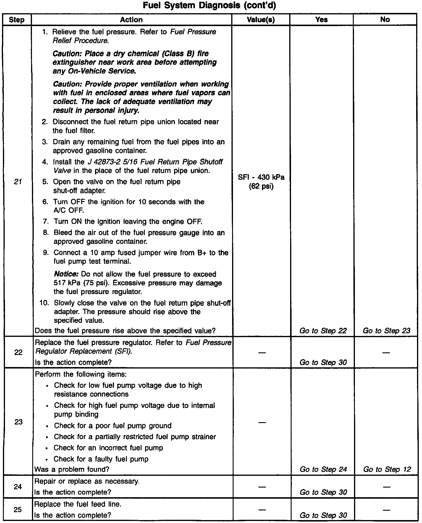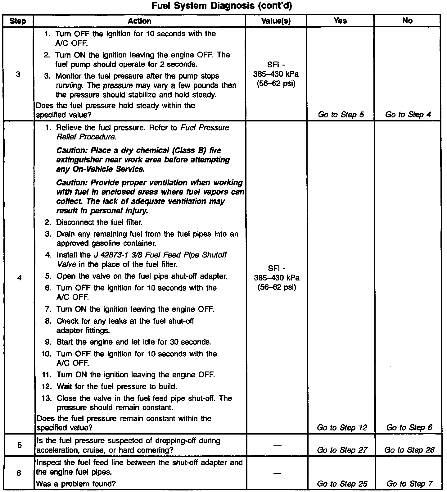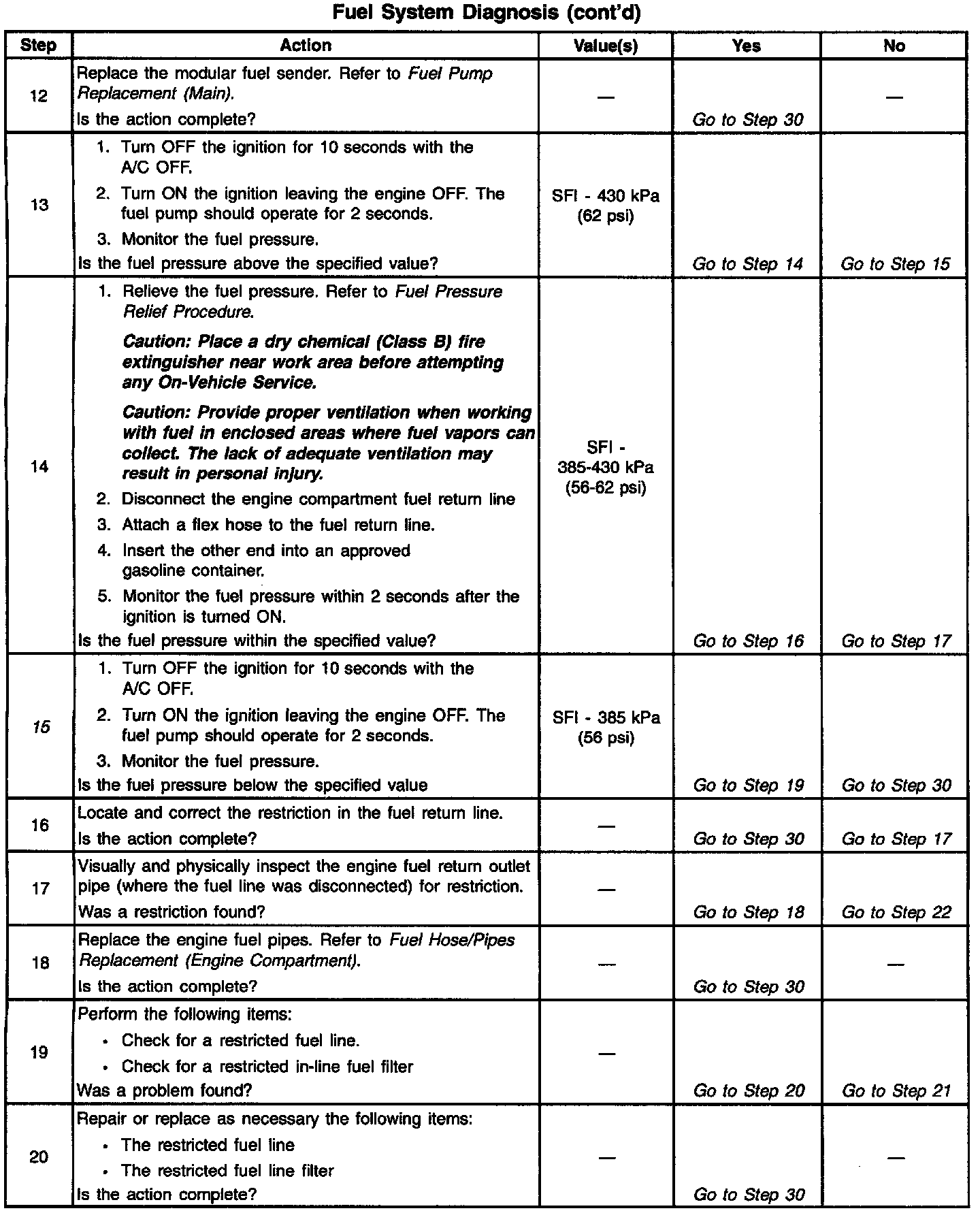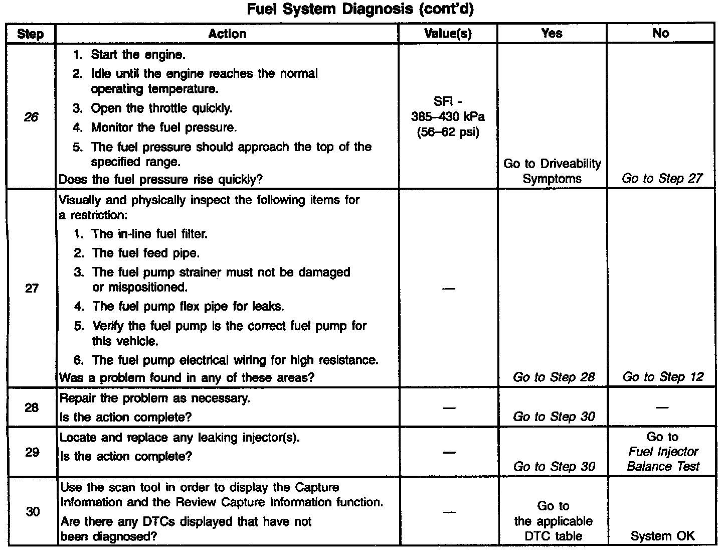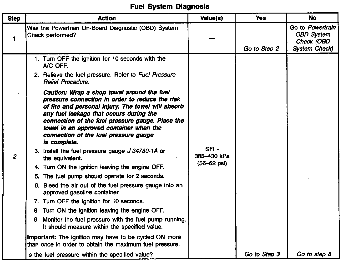 ^ The pressure is regulated but less than 385 kPa (56 psi).The amount of fuel reaching the injector is sufficient, but the pressure is too low. The system will run lean, hard starting cold, no start, overall poor performance, and may set a DTC. Refer to Engine Cranks but Does Not Run. Engine Cranks, But Will Not Run