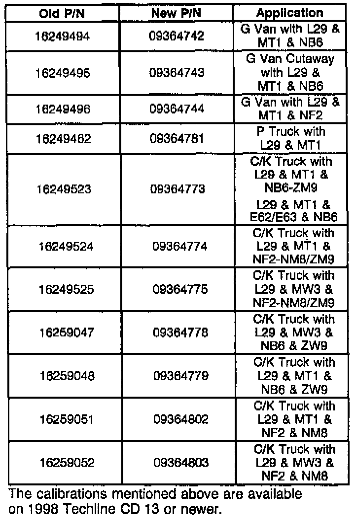 A new engine calibration has been developed for the 1998 and 1999 model year vehicles built before August of 1998. A new calibration for the 1996 and 1997 model year vehicles is being developed and this bulletin will be re-issued as soon as that information is available. The new calibration reduces the idle flare in terms of maximum RPM and length of time the flare occurs allowing the seconds necessary for thermal expansion of the piston in the bore.