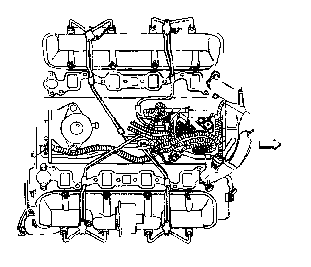 9. Remove the engine lift bracket and the bolt and washer, GM P/N 94282217 and GM P/N 15650963 from the cylinder head.