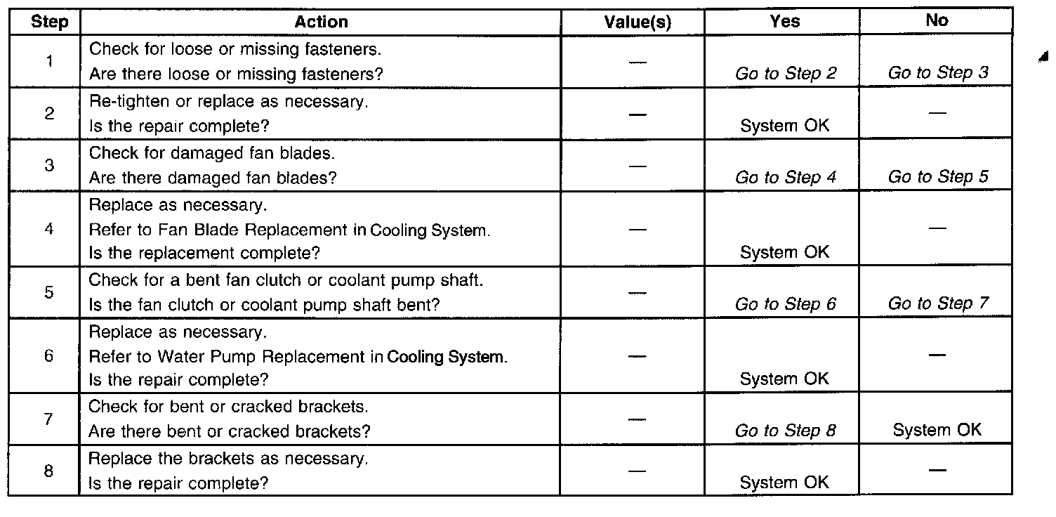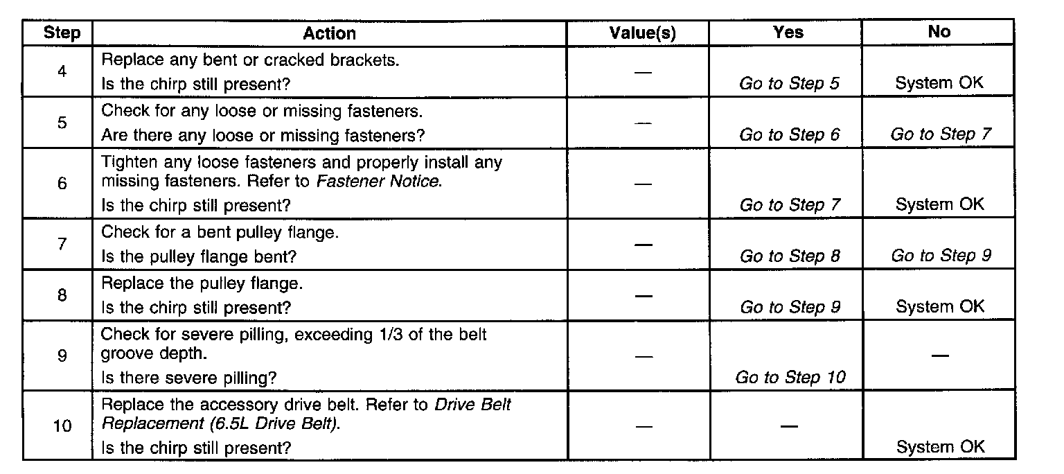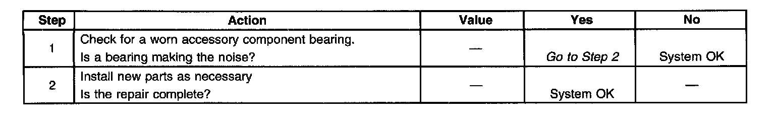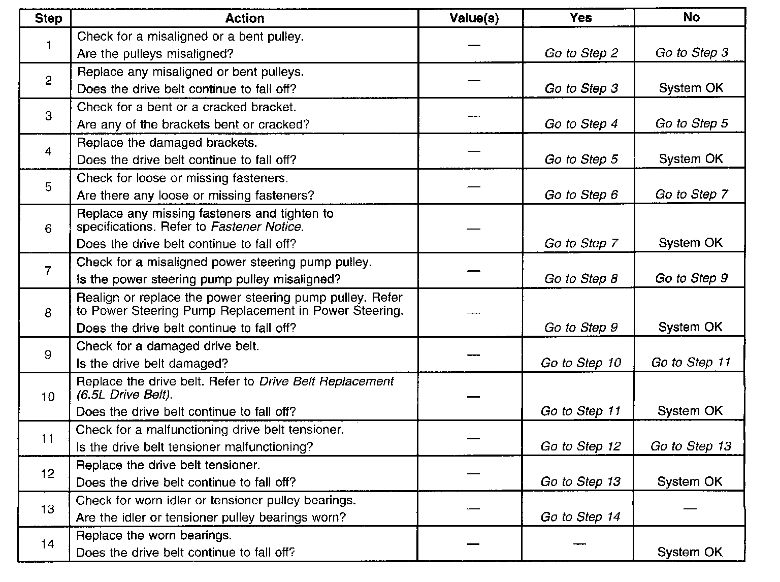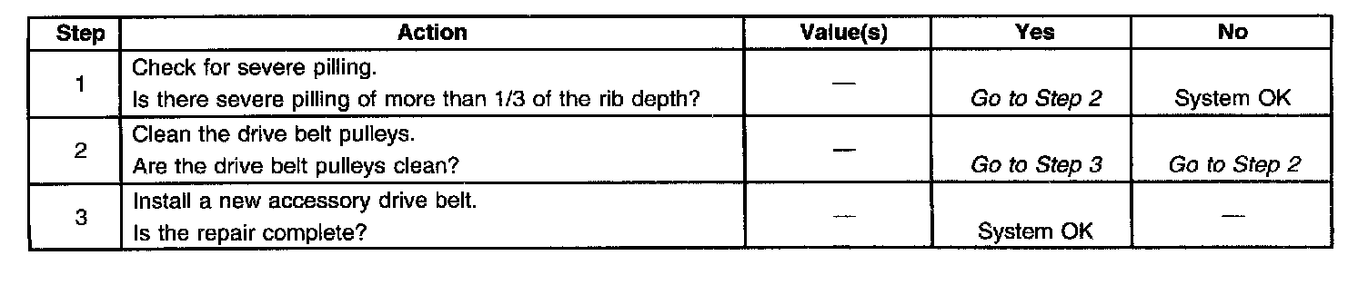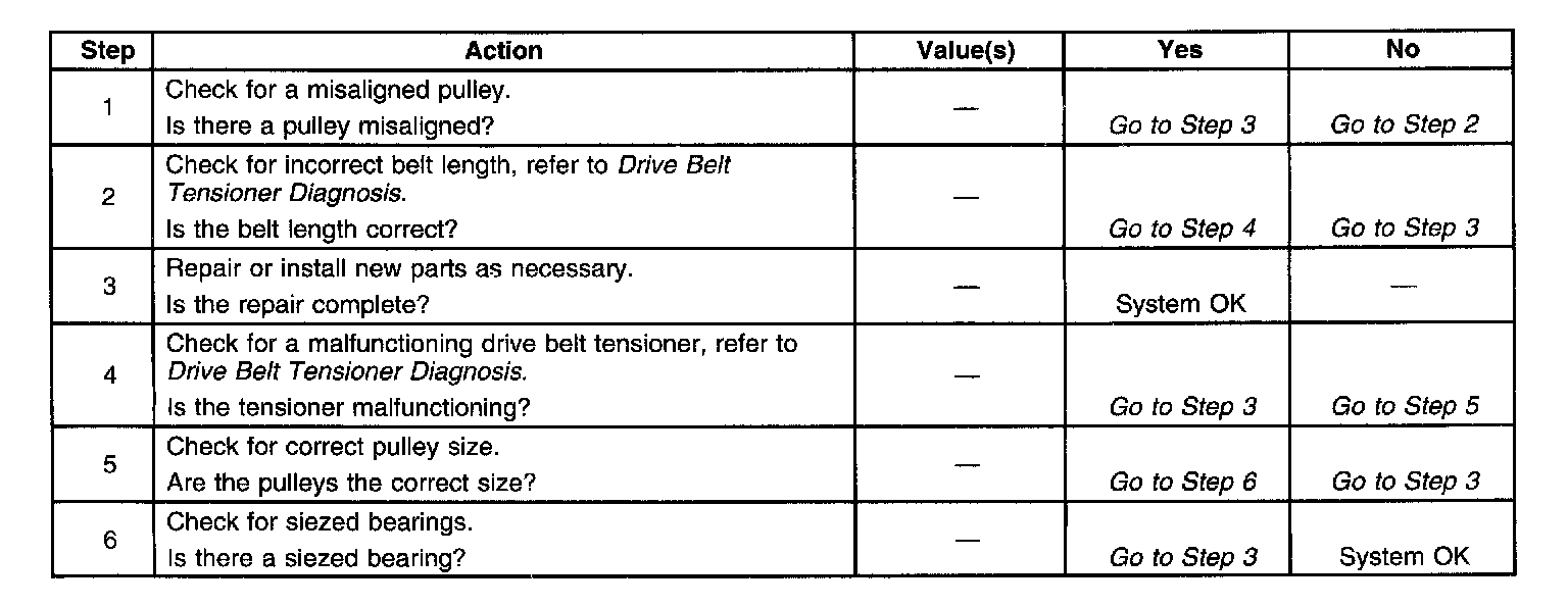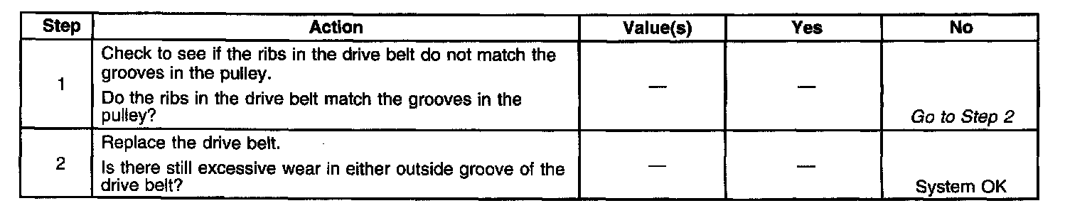 Multiple-ribbed type drive belts wear evenly with their pulleys. Unusual wear indicates a correction is needed. The following diagnostic tables will aid in diagnosing drive belt system conditions.