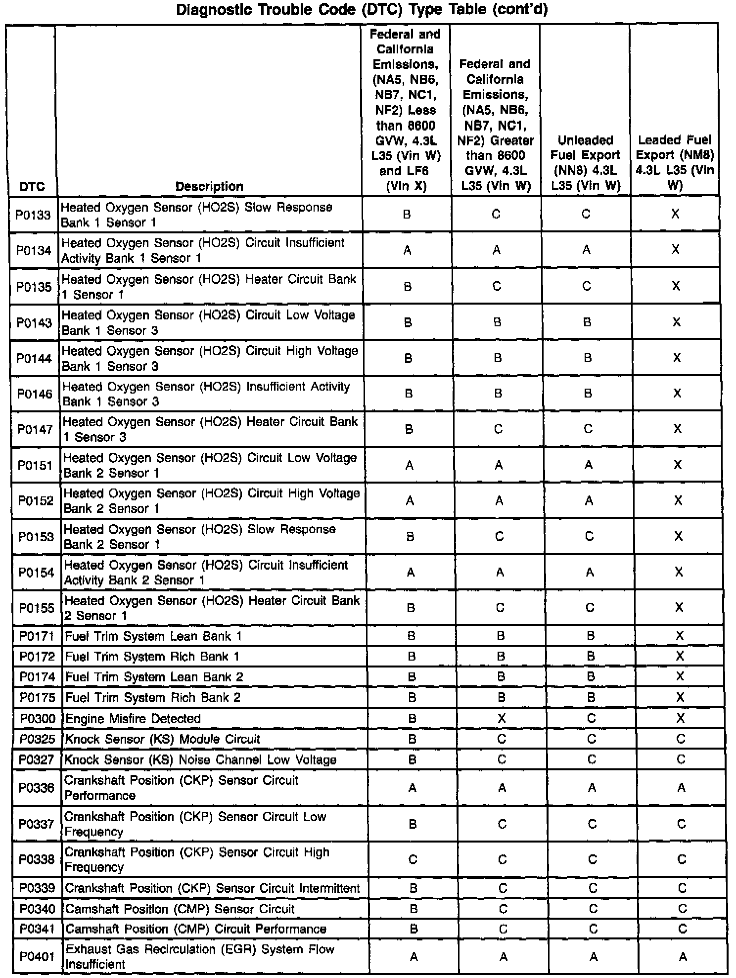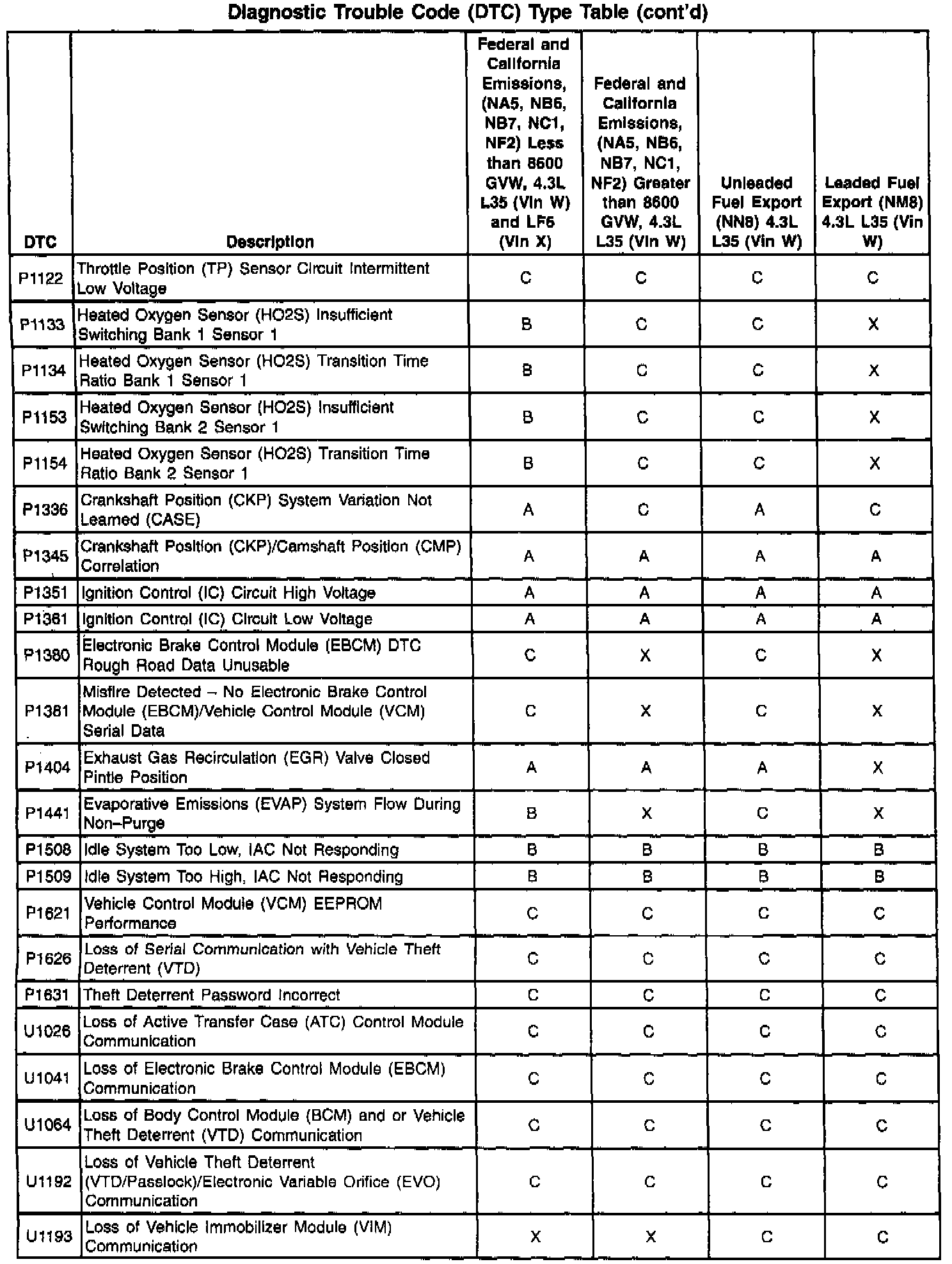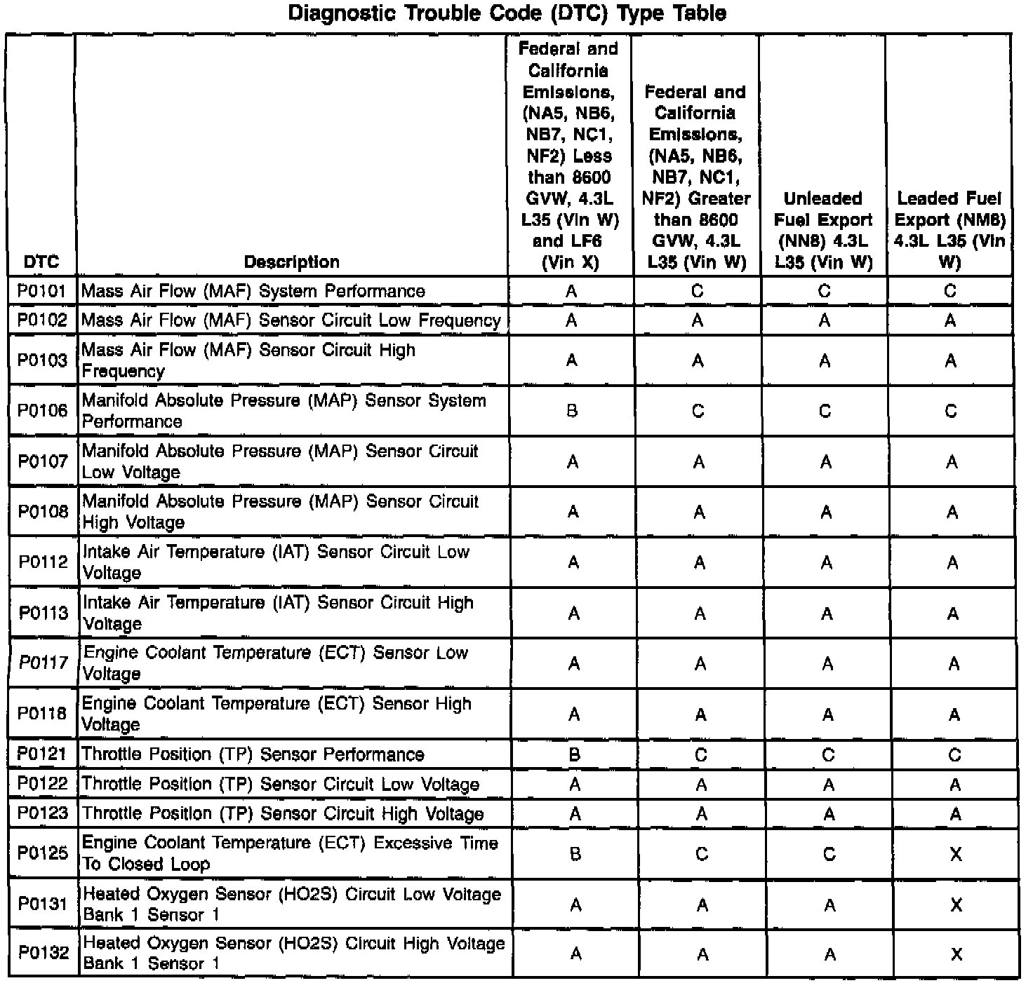 This information refers to domestic and Export calibration packages. Export vehicles may have differences in the DTC types that will affect the Malfunction Indicator Lamp (MIL) operation. Certain DTCs have been changed from type A to type C or, in some cases, type X. When a type A diagnostic fails, a DTC is set immediately and the Malfunction Indicator Lamp (MIL) is illuminated. When a type B DTC diagnostic fails, the Malfunction Indicator Lamp (MIL) will illuminate if the fault is present after two consecutive drive trips. A type C DTC will set after one failure and be stored in history but will not illuminate the Malfunction Indicator Lamp (MIL). Type X DTCs have been turned off (the diagnostic does not run, no codes are stored, and the Malfunction Indicator Lamp (MIL) will not illuminate.