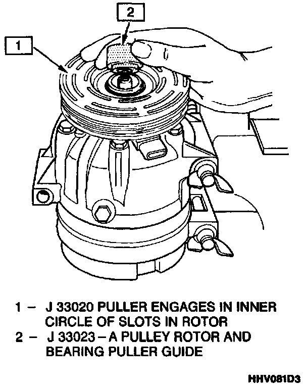 4. Hold the J 33020 puller in place and tighten the puller screw against the puller guide to remove the pulley rotor and bearing assembly.