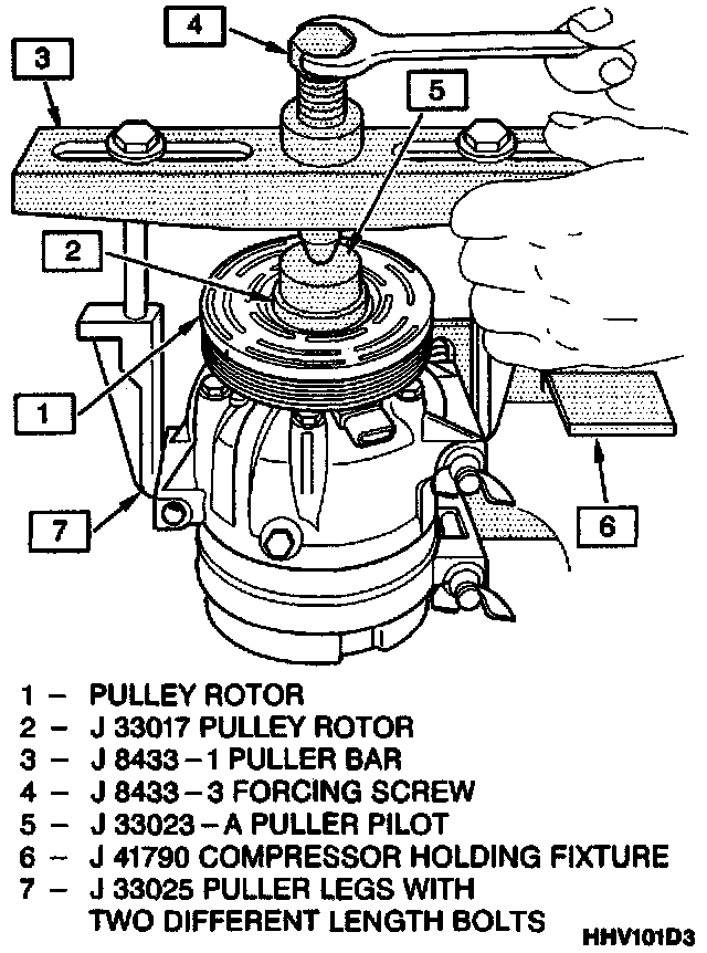 8. Tighten the center screw in the J 8433-1 puller crossbar to force the pulley rotor and bearing assembly onto the compressor front head. Should the J 33017 pulley rotor and bearing installer slip off direct in-line contact with the inner face of the bearing, loosen the J 8433-3 center forcing screw and realign the installer and pilot so that the J 33017 installer will properly clear the front head.