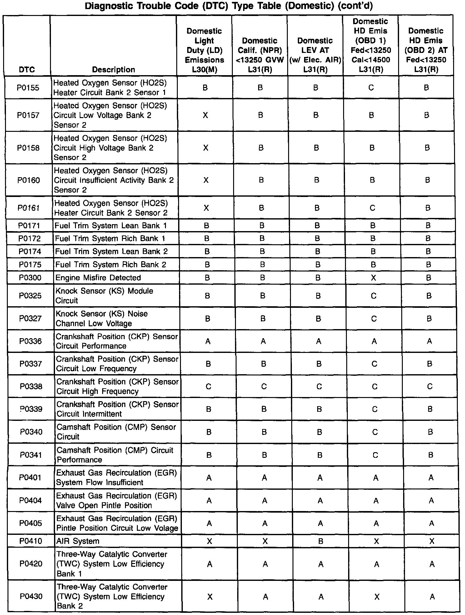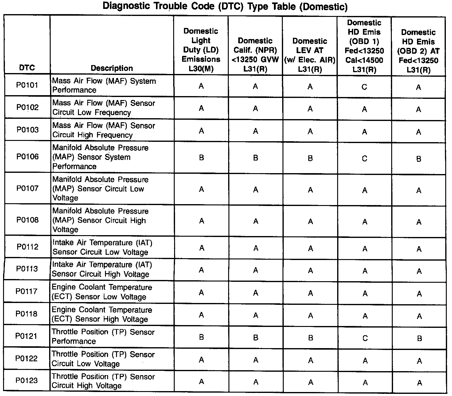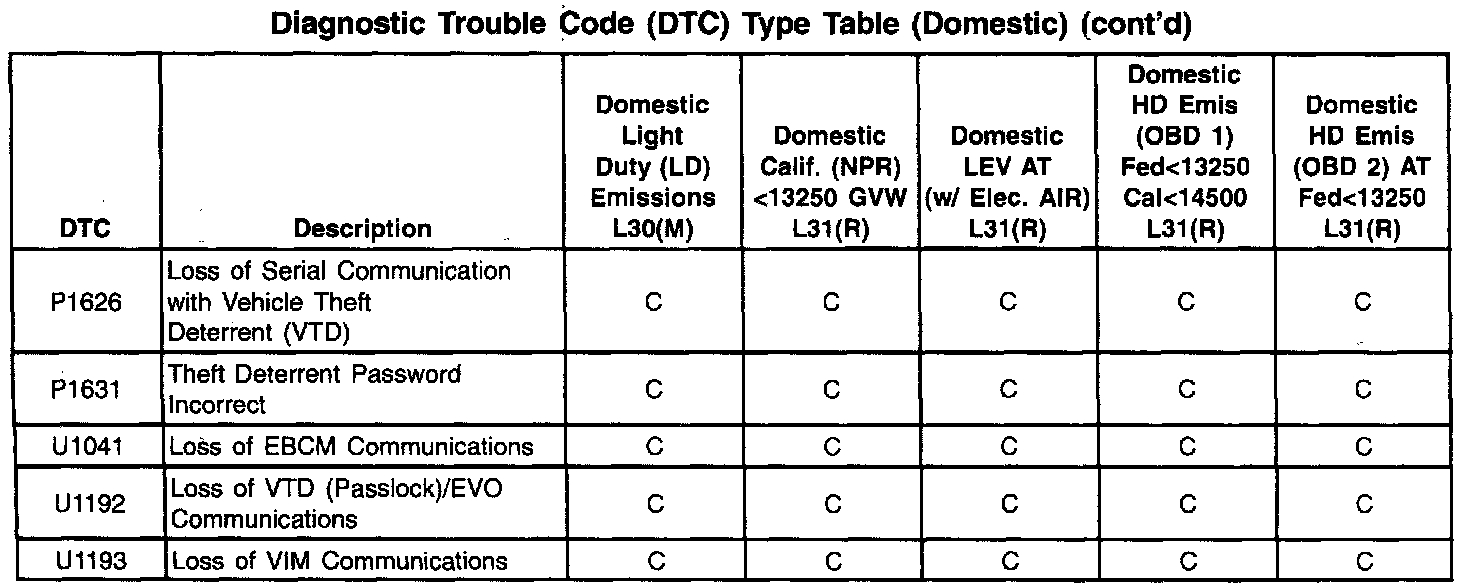 This information refers to Domestic and Export calibration packages. Export vehicles may have differences in DTC types that will affect Malfunction Indicator Lamp (MIL) operation. Certain DTCs have been changed from type A to type C or, in some cases, type X. When a type A diagnostic fails, a DTC is set immediately and the Malfunction Indicator Lamp (MIL) is illuminated. When a type B DTC diagnostic fails, the Malfunction Indicator Lamp (MIL) will illuminate if the fault is present after two consecutive drive trips. The type C DTC will set after one failure and be stored in history but will not illuminate the Malfunction Indicator Lamp (MIL). Type X DTCs have been turned off, the diagnostic does not run, no codes are stored, and the Malfunction Indicator Lamp (MIL) will not illuminate.