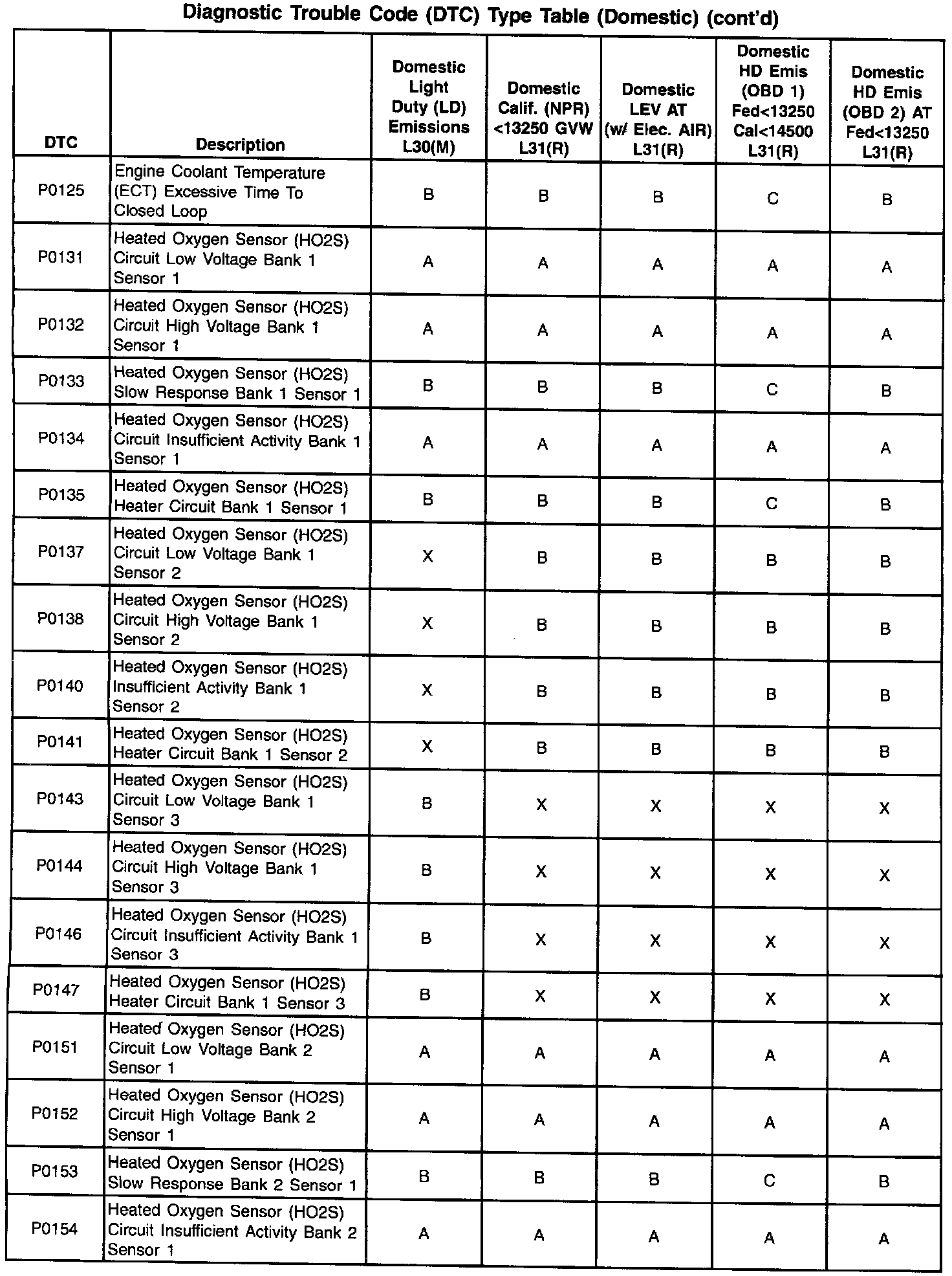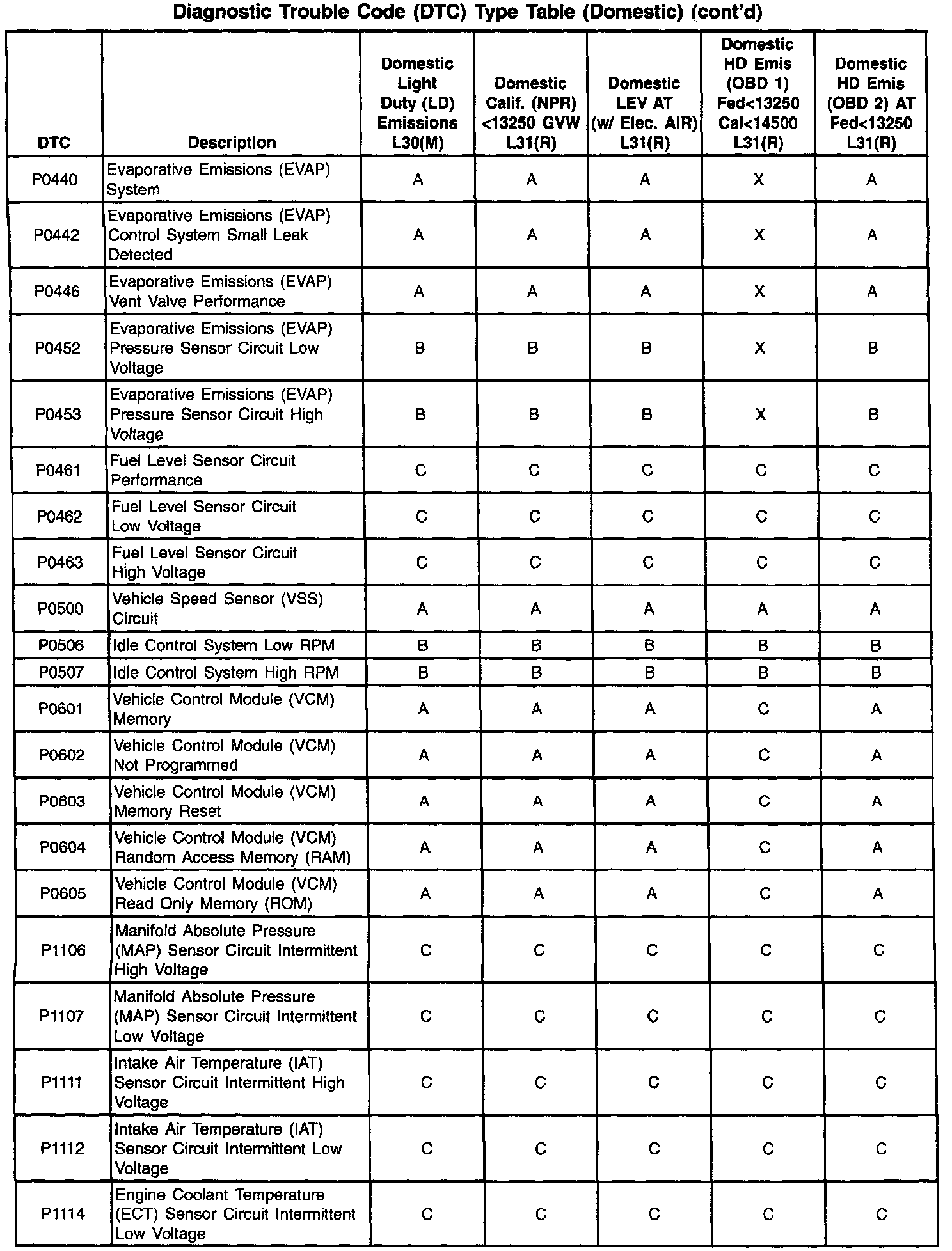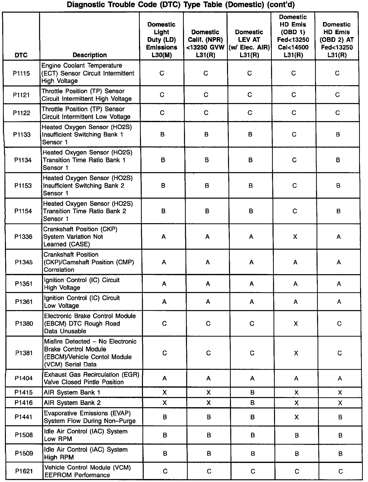 This information refers to Domestic and Export calibration packages. Export vehicles may have differences in DTC types that will affect Malfunction Indicator Lamp (MIL) operation. Certain DTCs have been changed from type A to type C or, in some cases, type X. When a type A diagnostic fails, a DTC is set immediately and the Malfunction Indicator Lamp (MIL) is illuminated. When a type B DTC diagnostic fails, the Malfunction Indicator Lamp (MIL) will illuminate if the fault is present after two consecutive drive trips. The type C DTC will set after one failure and be stored in history but will not illuminate the Malfunction Indicator Lamp (MIL). Type X DTCs have been turned off, the diagnostic does not run, no codes are stored, and the Malfunction Indicator Lamp (MIL) will not illuminate.