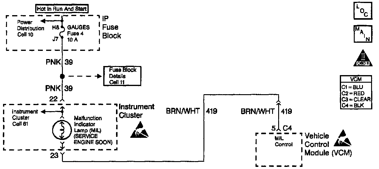 When the ignition switch is initially turned to the run position, the Malfunction Indicator Lamp (MIL) flashes and then remains On. When the engine is running and no Diagnostic Trouble Codes (DTCs) are stored, the Vehicle Control Module (VCM) turns Off the MIL. The ignition switch supplies battery voltage directly to the MIL telltale. The VCM controls the MIL by providing a ground path through the MIL control circuit in order to turn On the MIL.