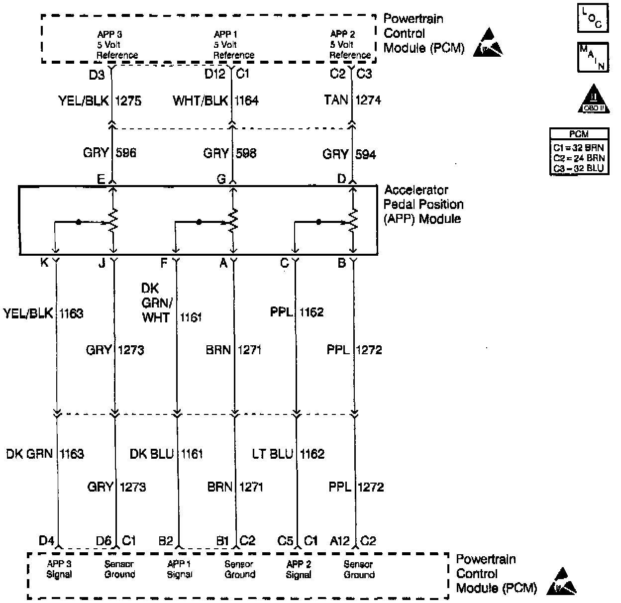 The Accelerator Pedal Position (APP) module provides a voltage signal that changes relative to accelerator pedal position. There are three sensors located within the APP module that are scaled differently.