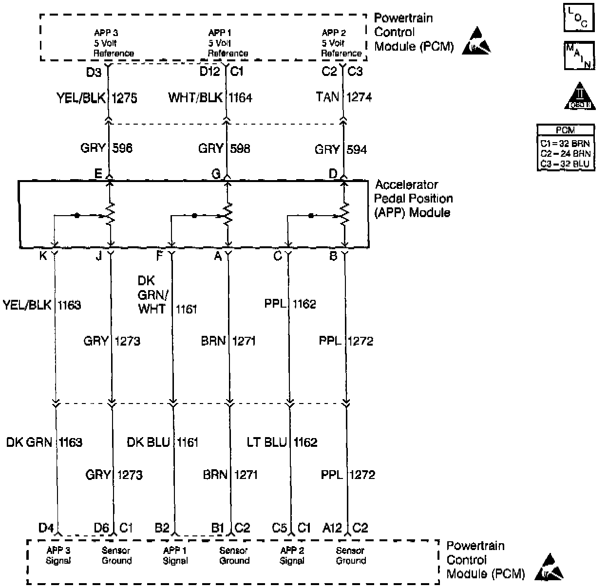 The Accelerator Pedal Position (APP) module provides a voltage signal that changes relative to the accelerator pedal position. There are three sensors located within the APP module that are scaled differently.