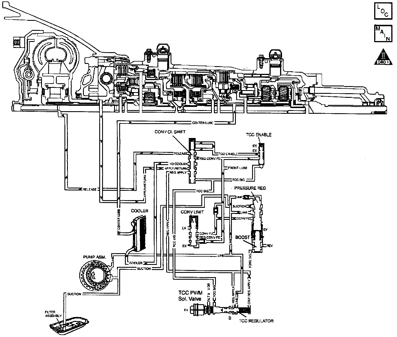 The flow of transmission fluid starts in the transmission pan. It is then drawn through the filter and transmission case into the oil pump assembly. The oil pump assembly pressurizes the fluid (line pressure), which becomes the main supply line of fluid. This fluid is directed to various components and hydraulic circuits within the transmission. The pressure regulator valve receives this fluid and directs it to the converter clutch shift valve. The converter clutch shift valve directs hot fluid leaving the torque converter or regulated converter feed fluid, through the cooler line to the transmission oil cooler. The transmission oil cooler is located in the radiator. The vehicle may also be equipped with an auxiliary oil cooler. The cooled fluid (center lube) is returned to the transmission trough the return cooler line and into center lube port of the transmission. The Automatic Transmission Fluid Temperature (TFT) Sensor, senses the fluid temperature in the transmission pan.