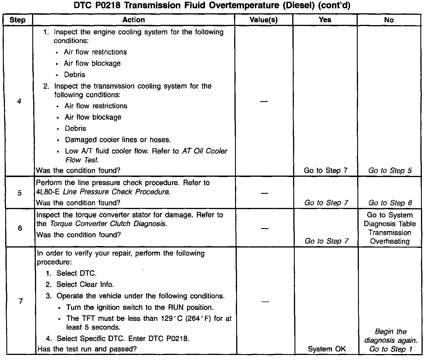 4. This step inspects for air restrictions and loss of transmission fluid flow, causing an extremely high TFT.