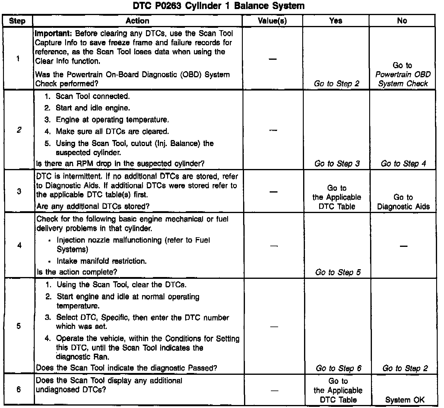 Injector balance test on scan tool should be used to confirm fault cylinder problems. Scan tool will cutout specific cylinder requested. It is possible that if a cylinder balance fault has been detected and engine has been running for a long time, the PCM will try to increase or decrease fuel in other cylinders to compensate for a rough idle which can cause multiple cylinder balance DTCs to set. The scan tool snap shot mode can be used to properly identify the suspected cylinder. The most likely cause of cylinder balance DTCs are malfunctioning nozzles.