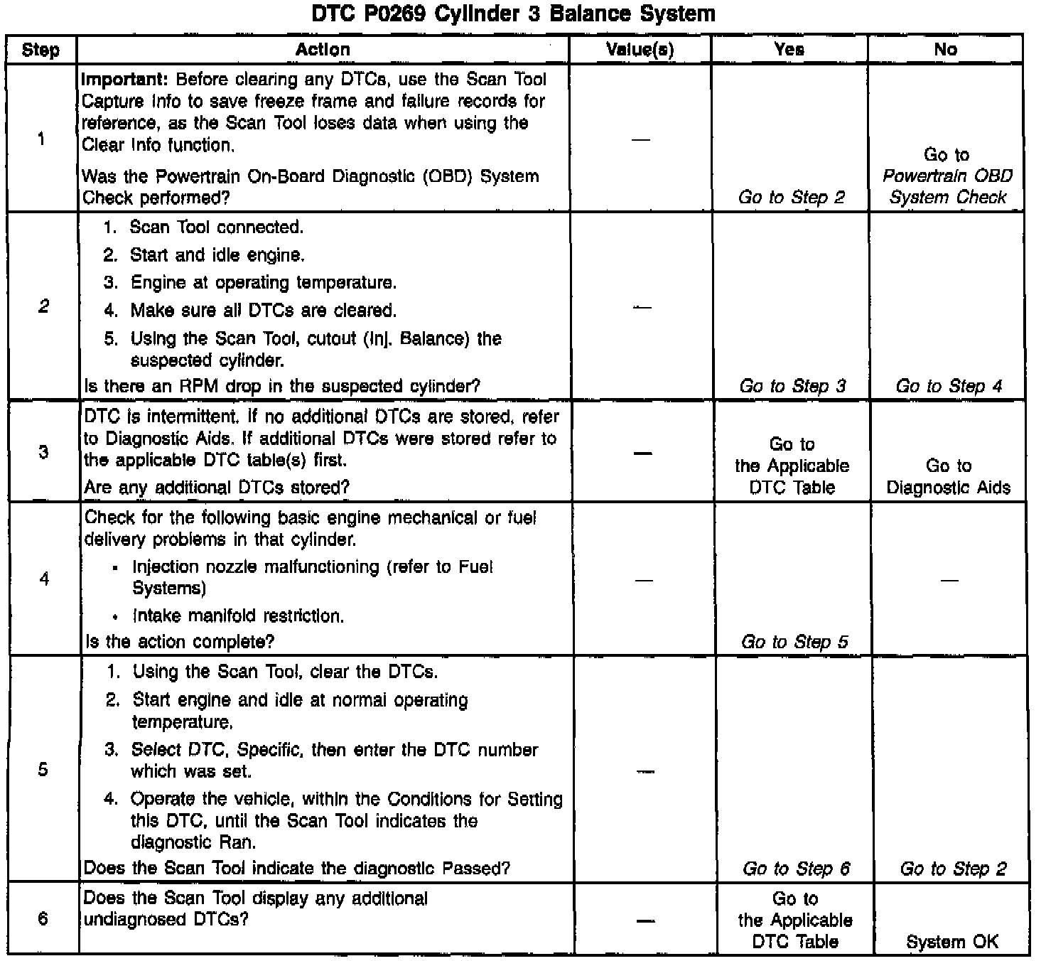 Injector balance test on scan tool should be used to confirm fault cylinder problems. Scan tool will cutout specific cylinder requested. It is possible that if a cylinder balance fault has been detected and engine has been running for a long time, the PCM will try to increase or decrease fuel in other cylinders to compensate for a rough idle which can cause multiple cylinder balance DTCs to set. The scan tool snap shot mode can be used to properly identify the suspected cylinder. The most likely cause of cylinder balance DTCs are malfunctioning nozzles.