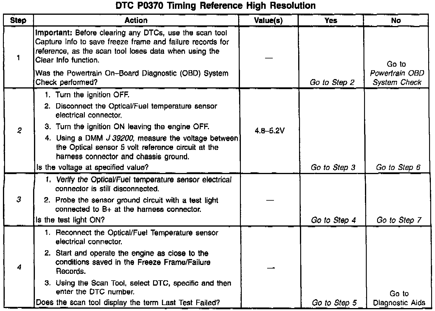 4. This step determines if the problem is currently active by the scan tool displaying Last Test Failed. Do not proceed any further with this table if the scan tool does not display the term Last Test Failed. Duplicating the conditions in Freeze Frame and Failure Records can help create an active fault.