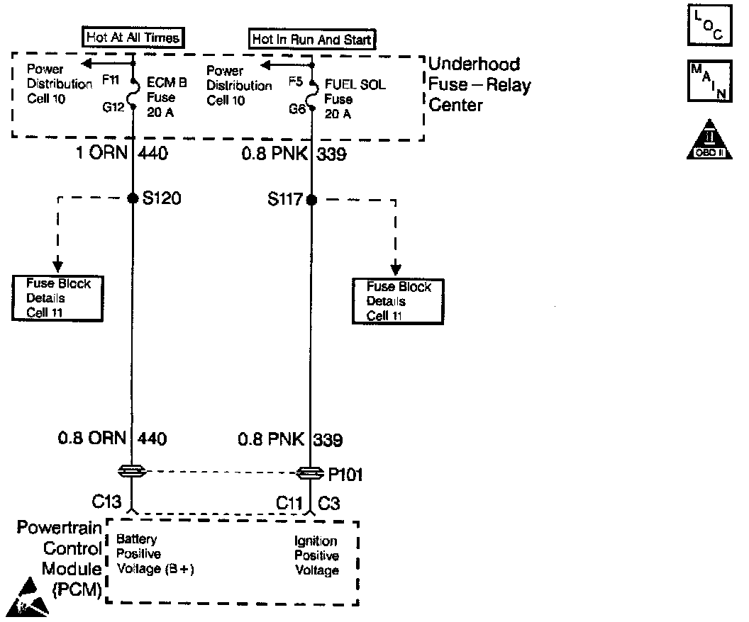 Circuit 339 is the ignition voltage feed for the Powertrain Control Module (PCM). Circuit 440 is the battery feed for the PCM.
