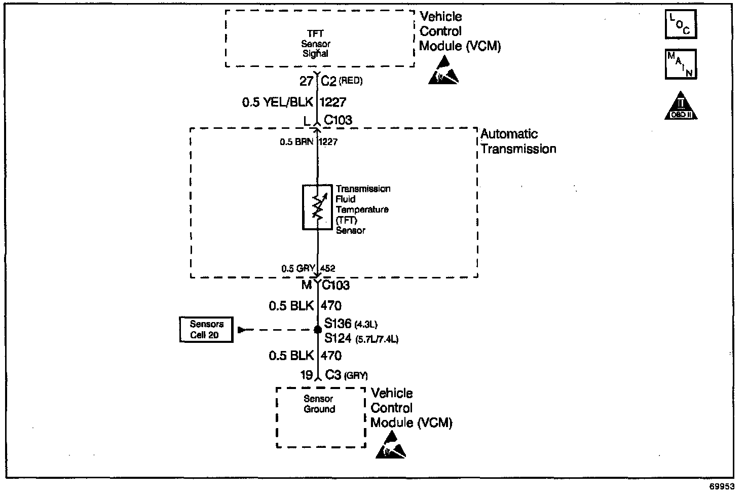 The Automatic Transmission Fluid Temperature (TFT) Sensor is part of the 4L80-E Automatic Transmission Wiring Harness Assembly (A/T Wiring Harness Assy). The TFT Sensor is a resistor, or thermistor, which changes value based on temperature. The sensor has a negative-temperature coefficient. This means that as the temperature increases, the resistance decreases, and as the temperature decreases the resistance increases. The Vehicle Control Module (VCM) supplies a 5-volt reference signal to the sensor on circuit 1227 and measures the voltage drop in the circuit. When the transmission fluid is cold, the sensor resistance is high and the VCM detects high signal voltage. As the fluid temperature warms to a normal operating temperature, the resistance becomes less and the signal voltage decreases. The VCM uses this information to control shift quality and torque converter clutch apply.